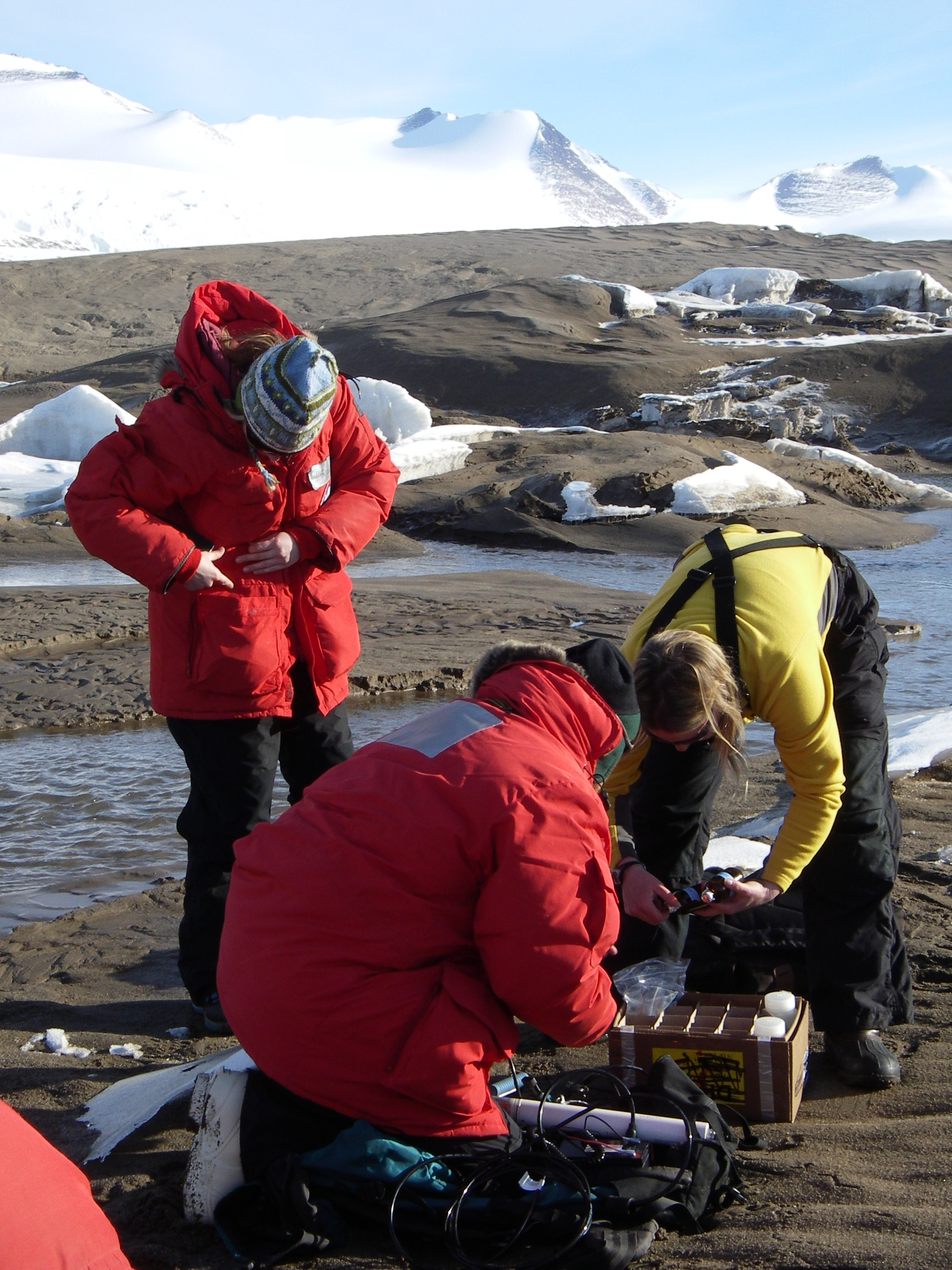 Heidi Smith, Collin Ward, and Dr. Christine Foreman get a water sample from Cotton Glacier, McMurdo Dry Valleys, Antarctica.