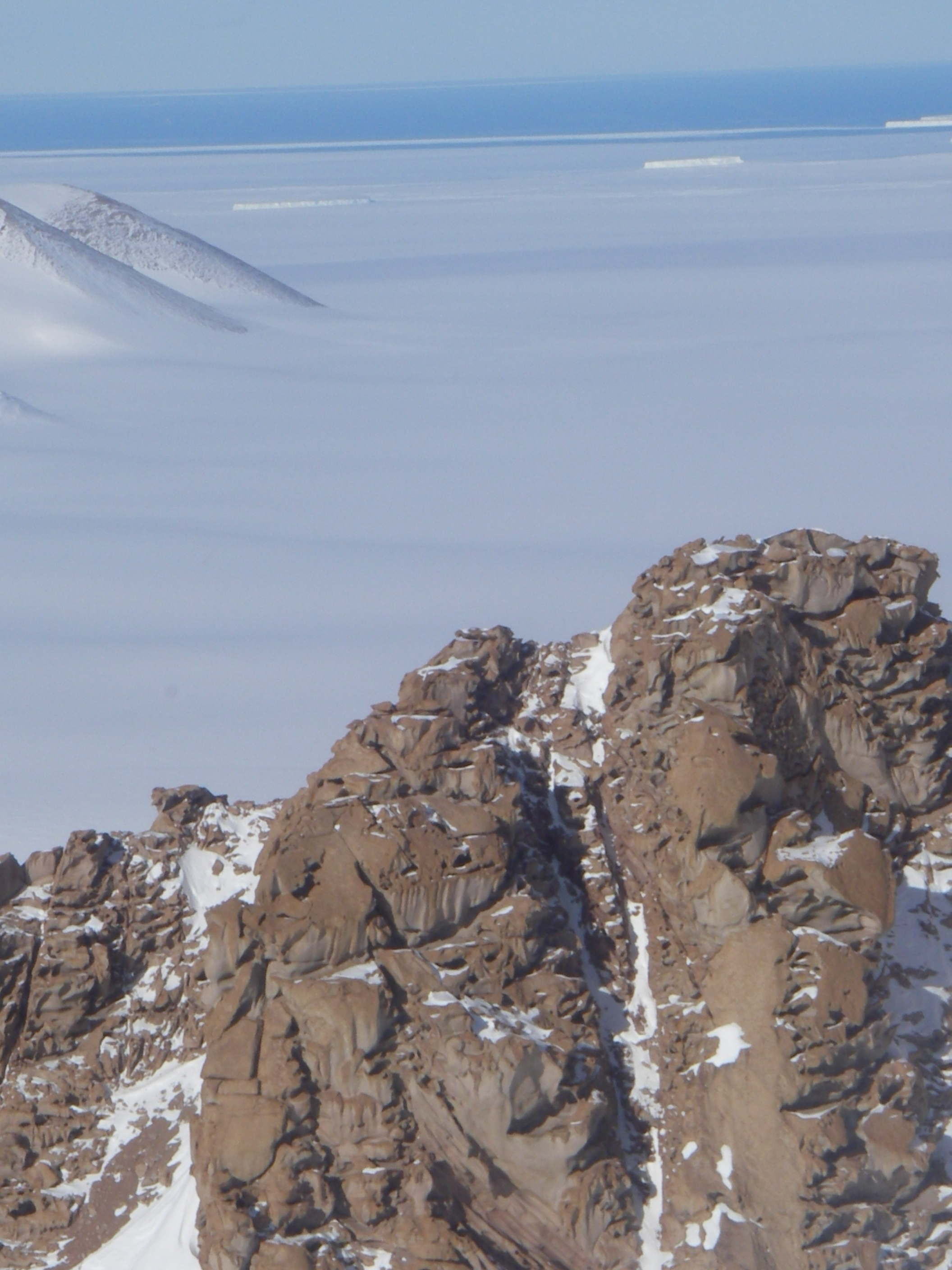 The Transantarctic Mountains and the Ross Ice Shelf. Aboard a helicopter flying over the Transantarctic Mountains in Antarctica.