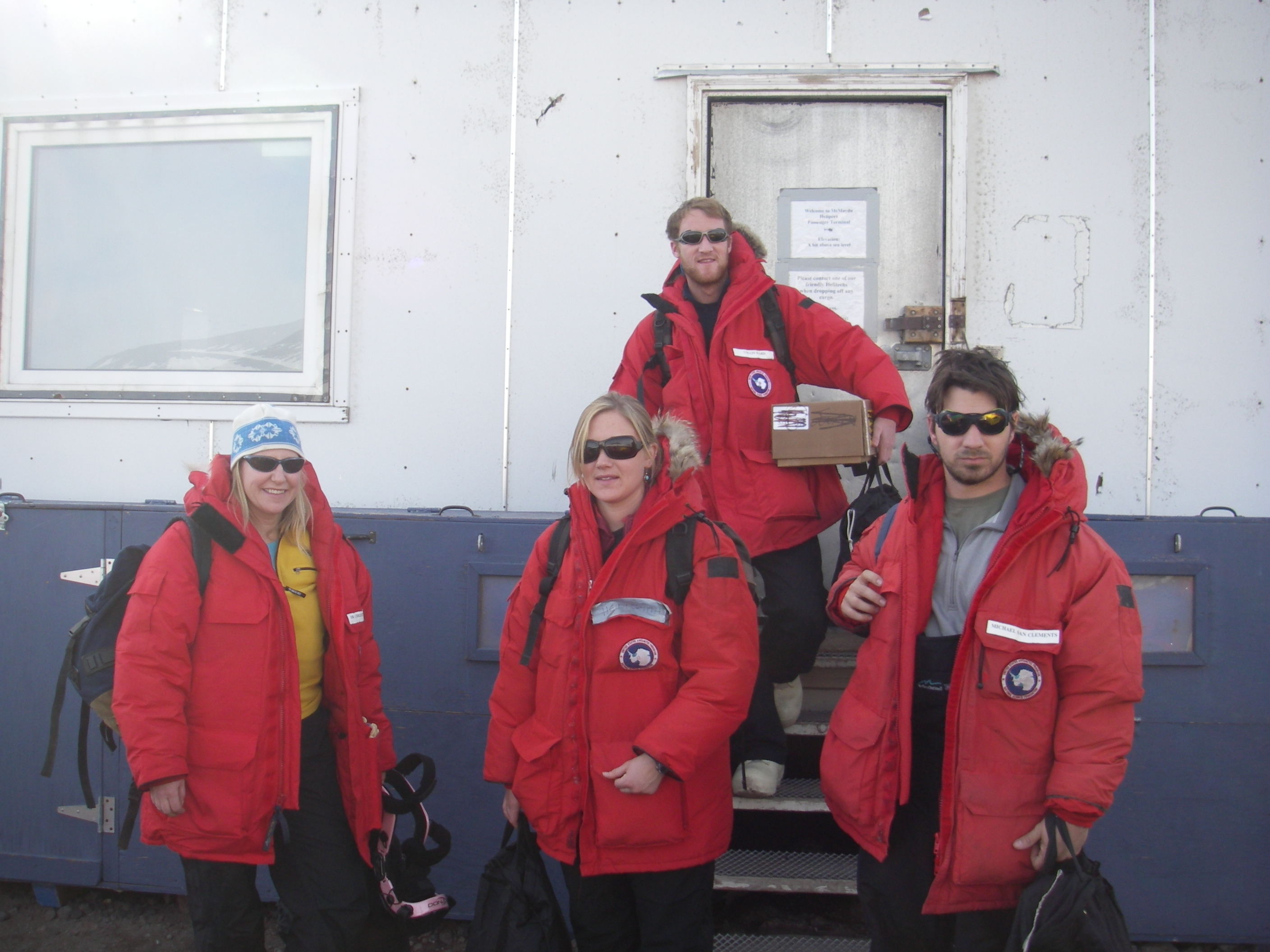 Dr. Christine Foreman, Heidi Smith, Collin Ward, and Mike San Clements wait for their first helicopter ride of the expedition. McMurdo Station, Antarctica.