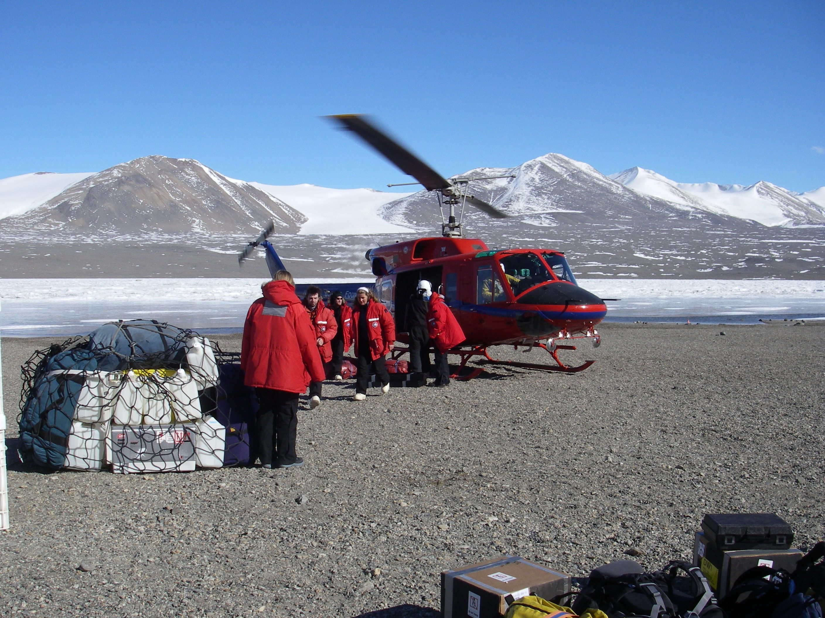 The team uploads more gear from the helicopter. Lake Fryxell, McMurdo Dry Valleys, Antarctica.