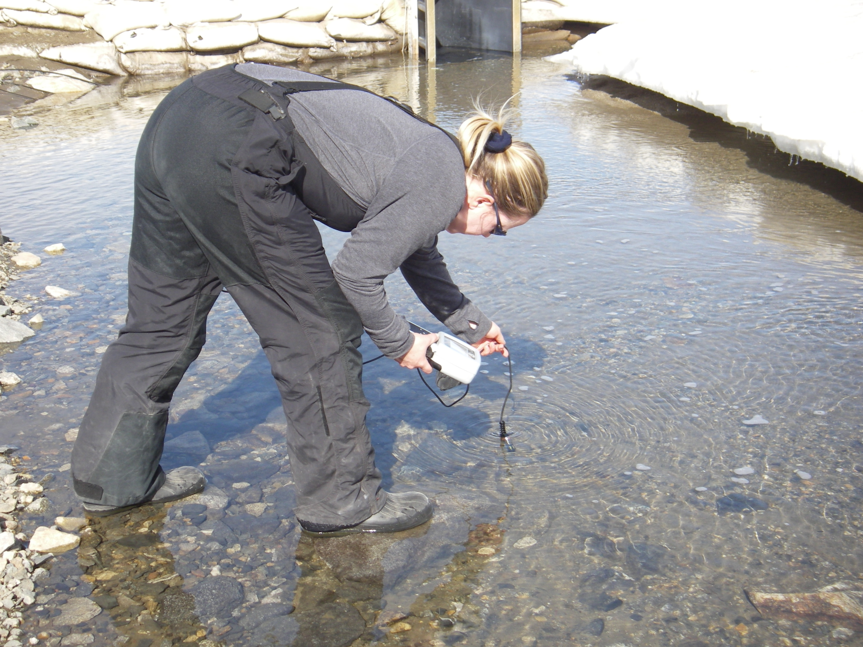 Dr. Christine Foreman uses the DO meter to determine the dissolved oxygen and temperature of the Canada Stream. Lake Fryxell, McMurdo Dry Valleys, Antarctica.