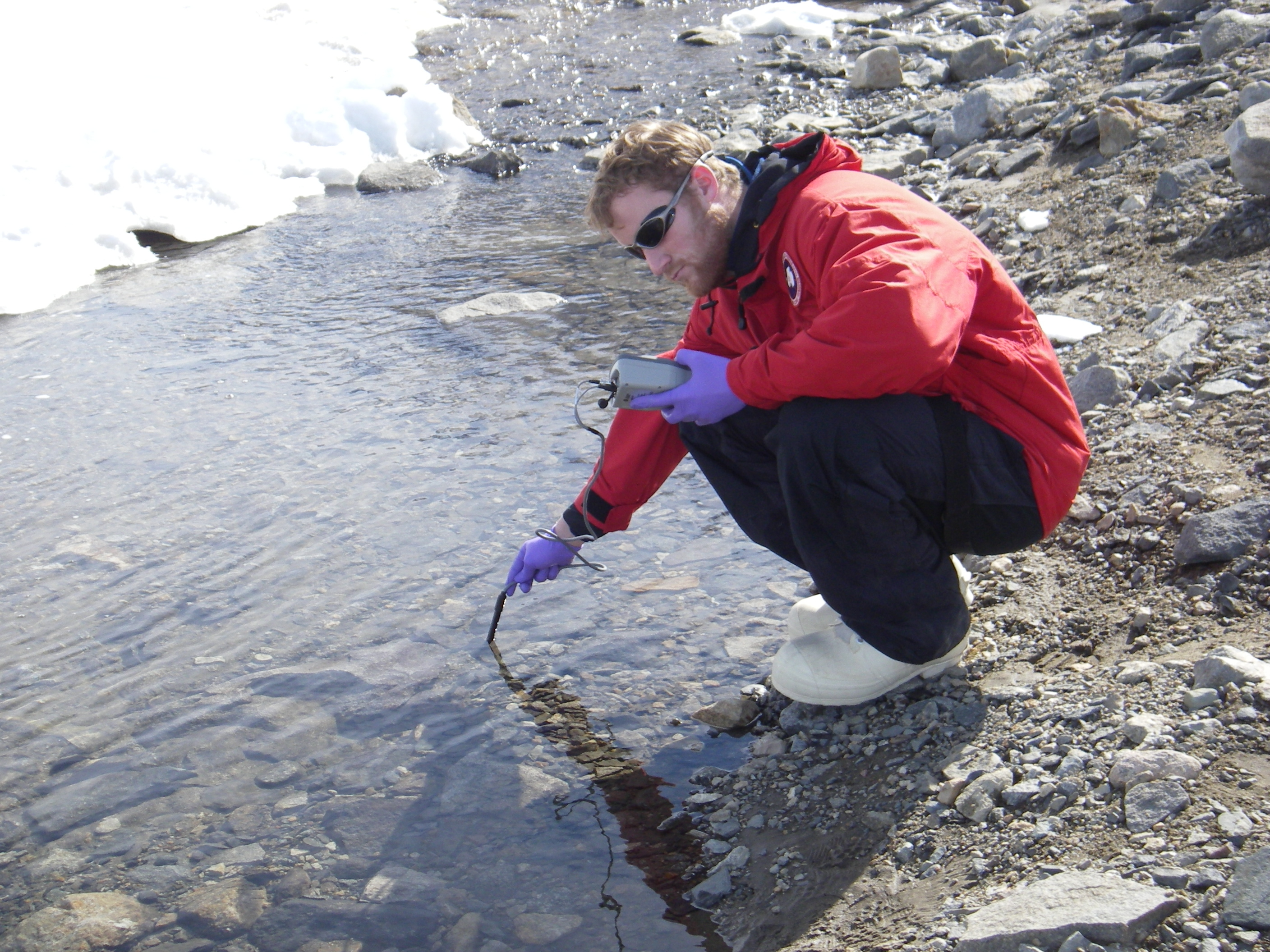 Collin Ward tests the pH of the Canada Stream to determine how acidic or basic it is. Lake Fryxell, McMurdo Dry Valleys, Antarctica.