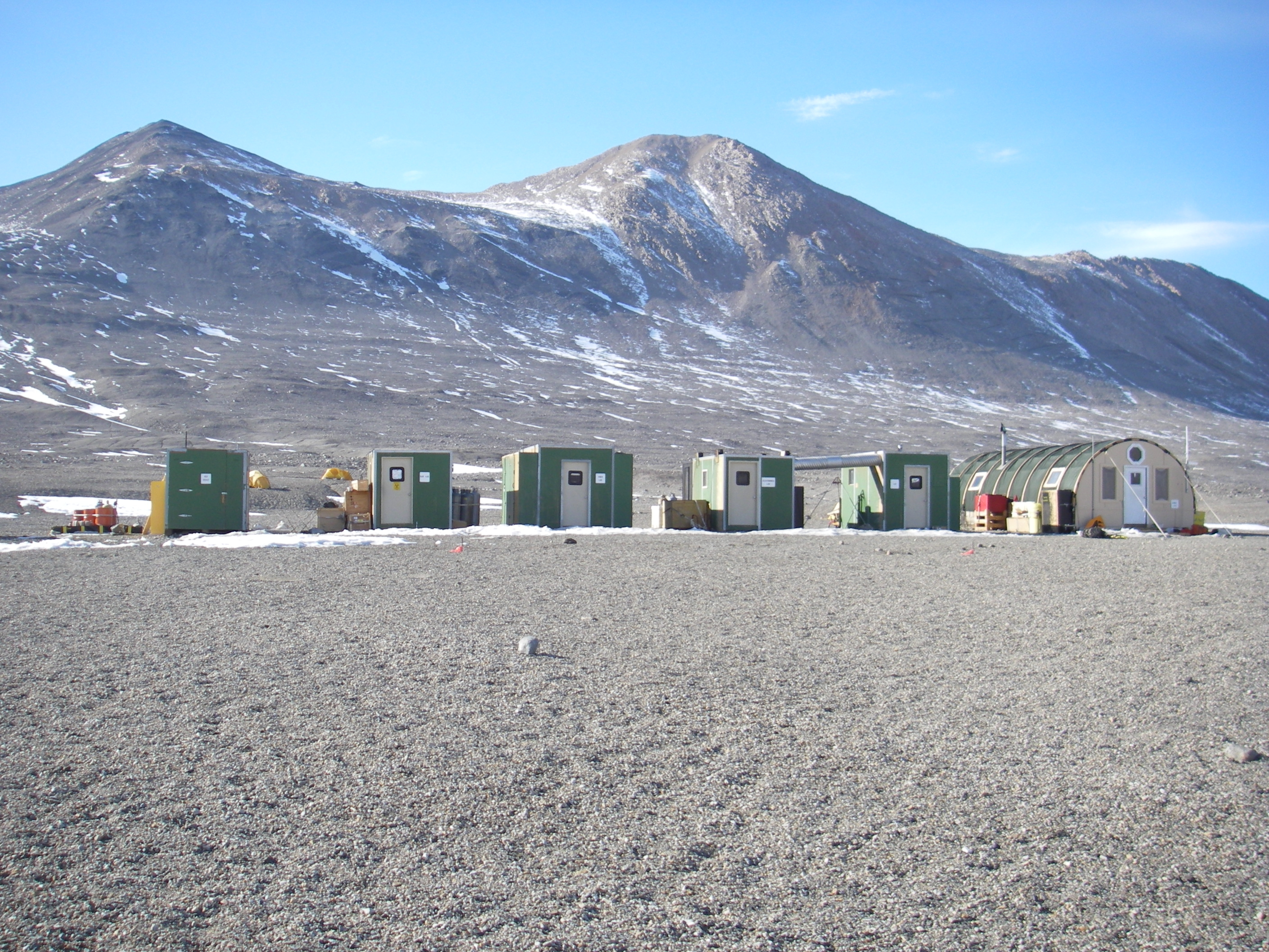 All of the buildings at Lake Fryxell are semi-permanent to reduce the camp's impact on the environment. Lake Fryxell, McMurdo Dry Valleys, Antarctica.