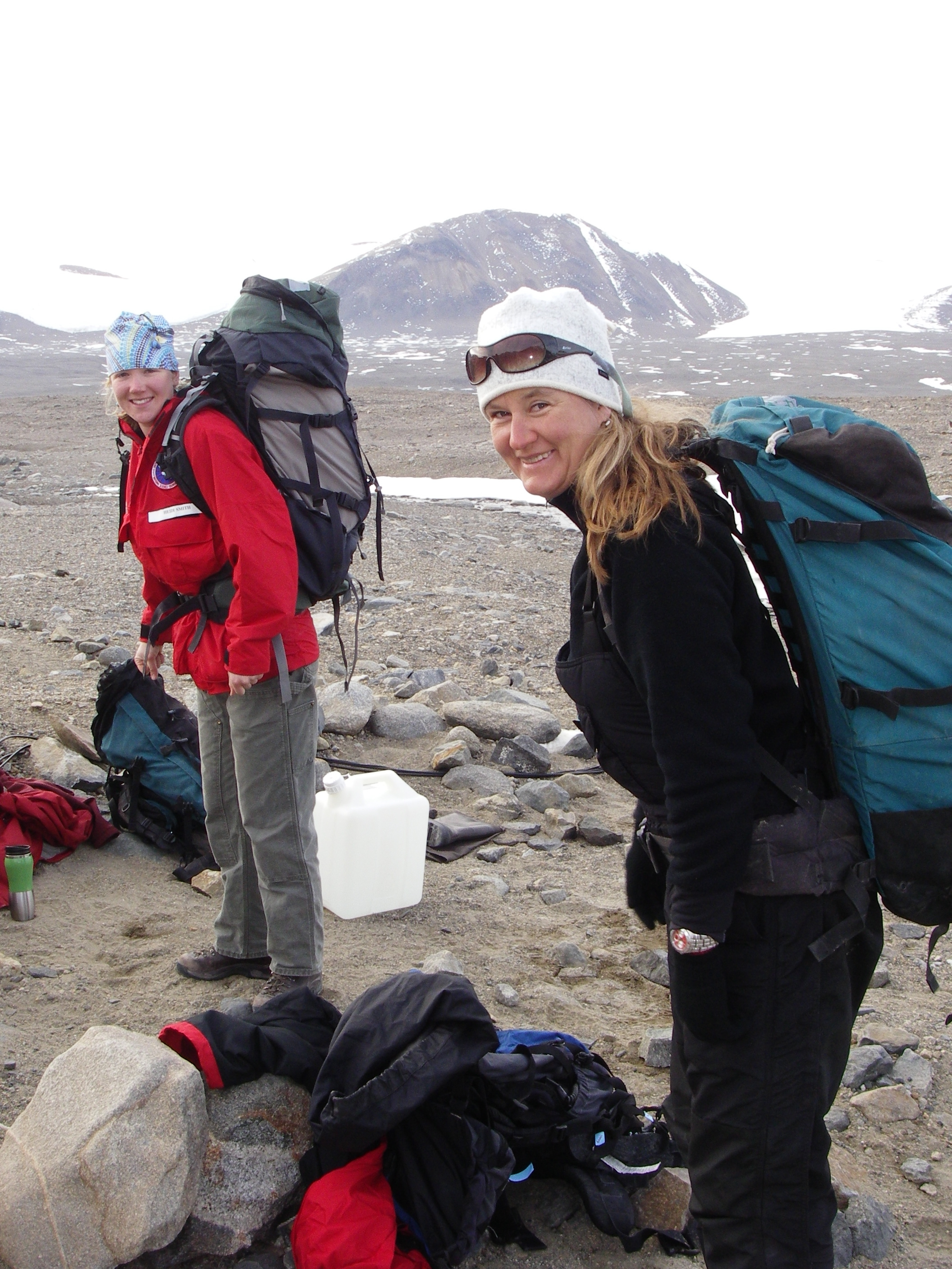Heidi Smith and Birgit Sattler get ready to pack 45 pound carboys back to the team's ATV on Lake Fryxell. Lake Fryxell, McMurdo Dry Valleys, Antarctica.