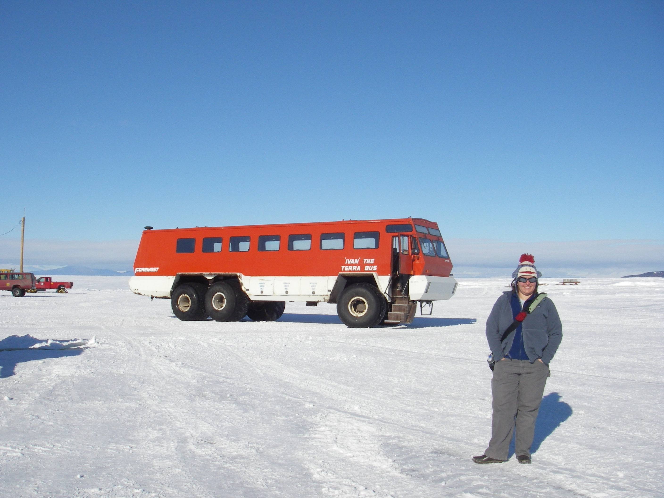 Sarah Diers: "With tires almost as tall as me, this beast of a bus shuttles the people of McMurdo to and fro." Long Duration Balloon Site, Antarctica.