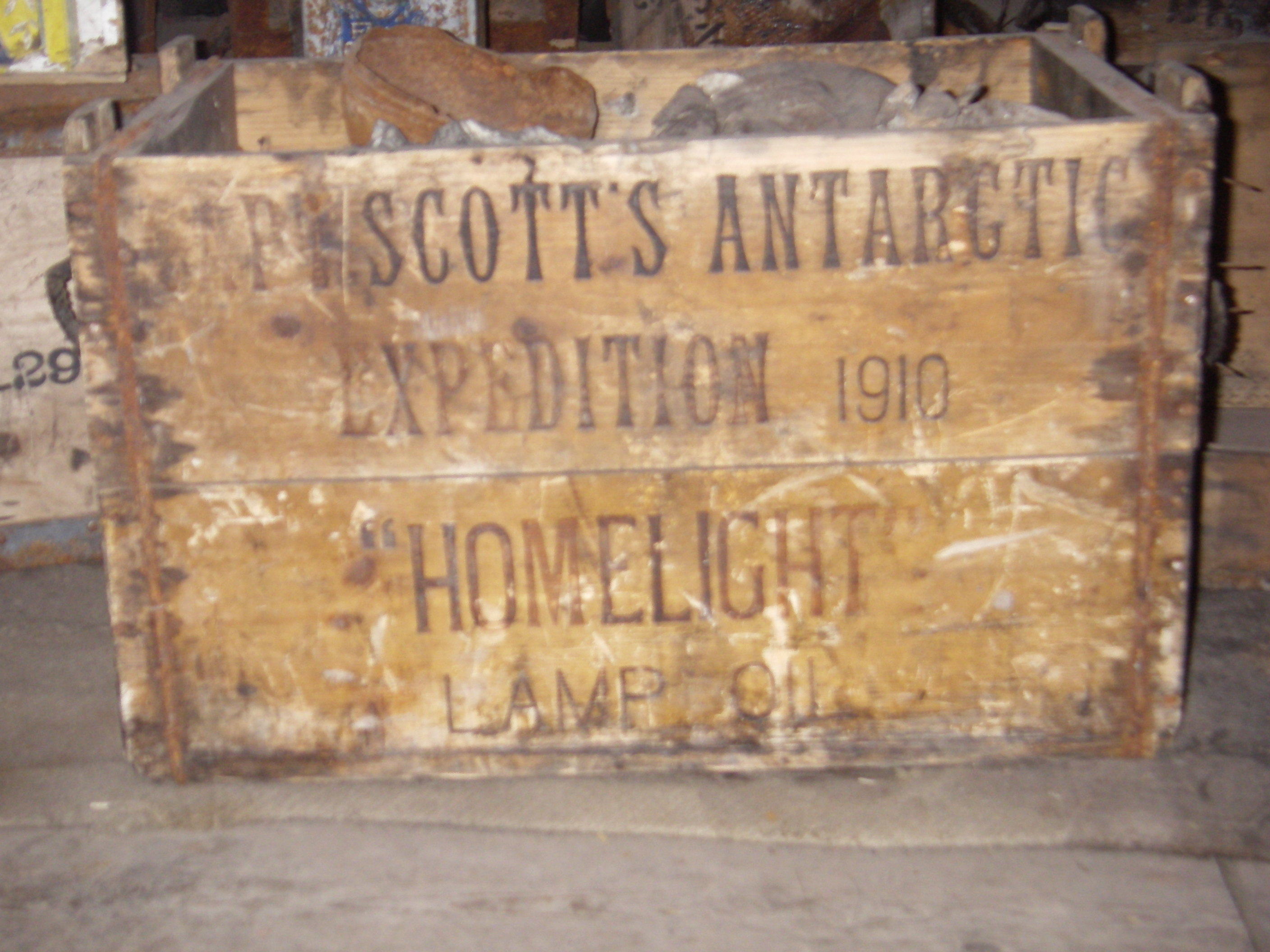 A cargo box for lanterns used by R.F. Scott's expedition. Inside the Discovery Hut on Hut Point, near McMurdo Station, Antarctica.