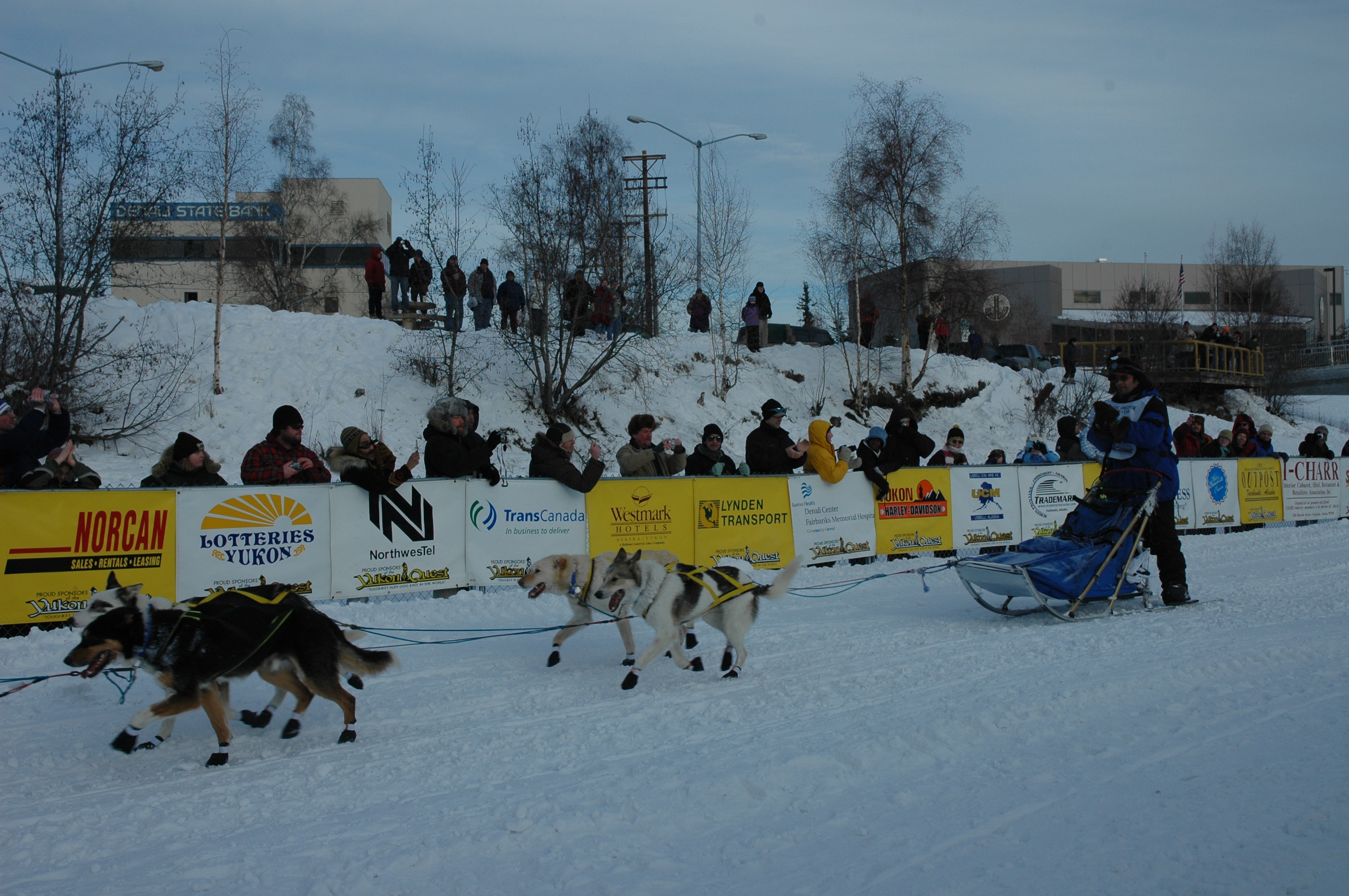 Simone Welch: "Check out their booties and the fur strap under their bellies!" At the finish line of the 1000 mile Yukon Quest sled dog race. Fairbanks, Alaska.