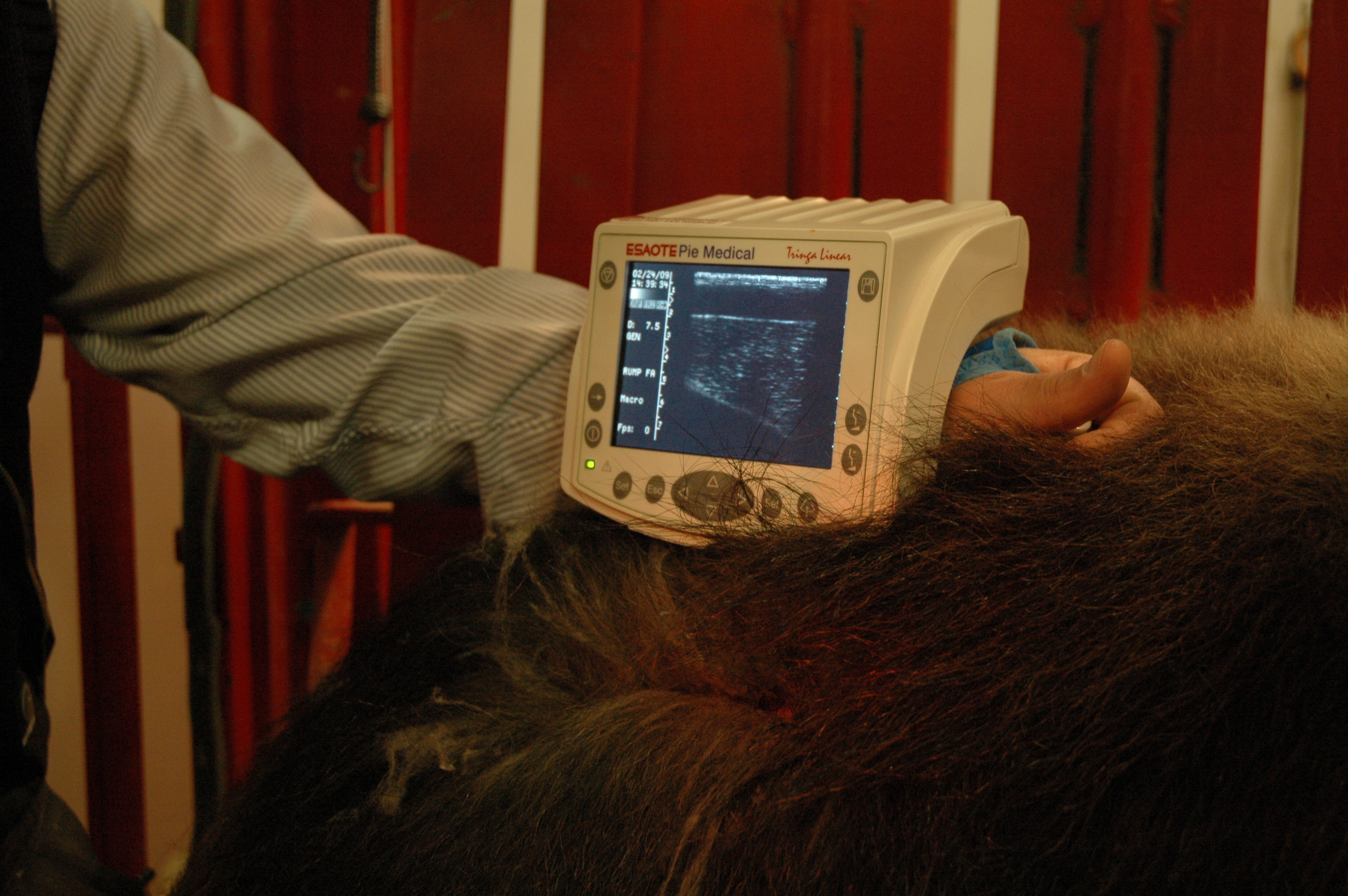 Scientists at the Large Animal Research Station use ultrasound machines to look inside animals without having to do surgery. Fairbanks, Alaska.