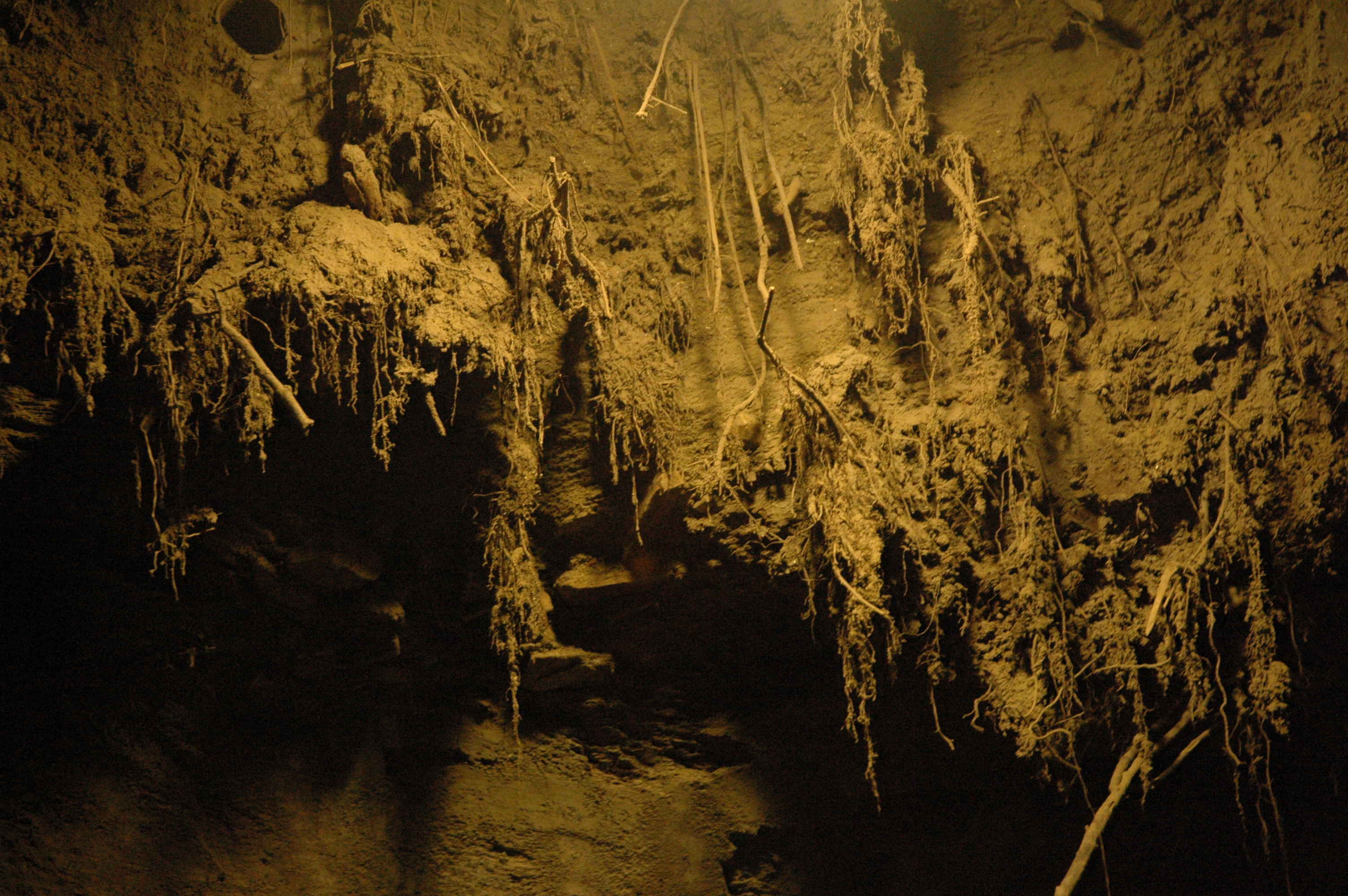 Little rootlets popping out of the ceiling of the Permafrost Research Tunnel in Fox, Alaska.