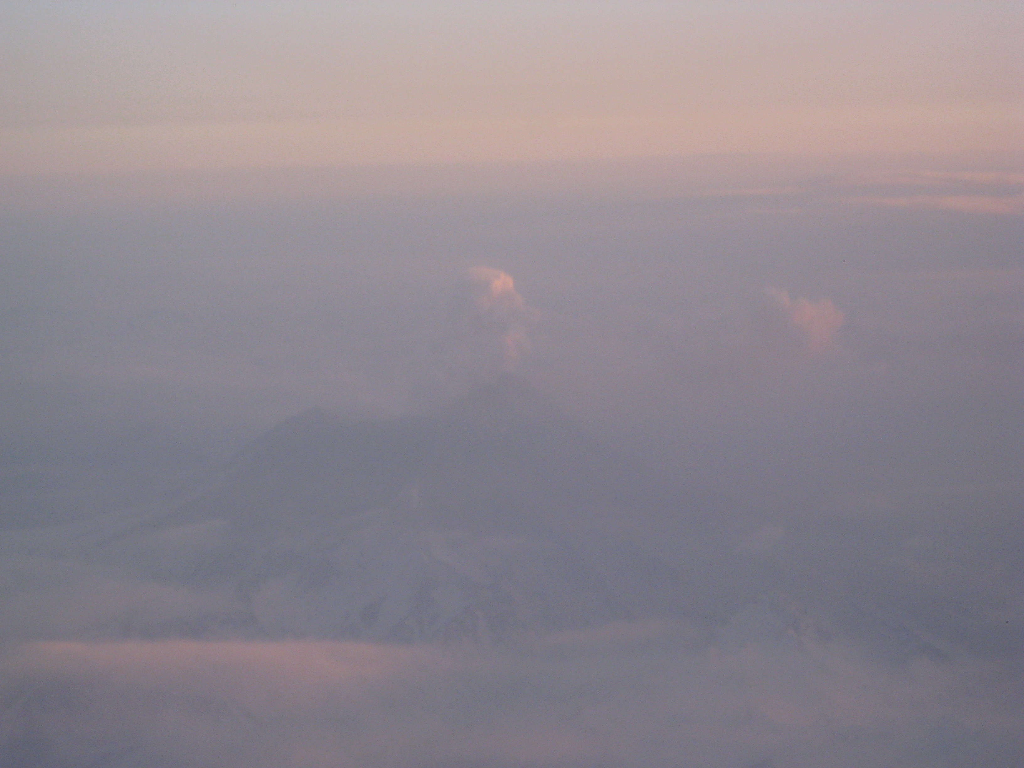 Mount Redoubt in action. Look carefully to see the cloud of ash rising. On the flight to UnAlaska, Alaska.