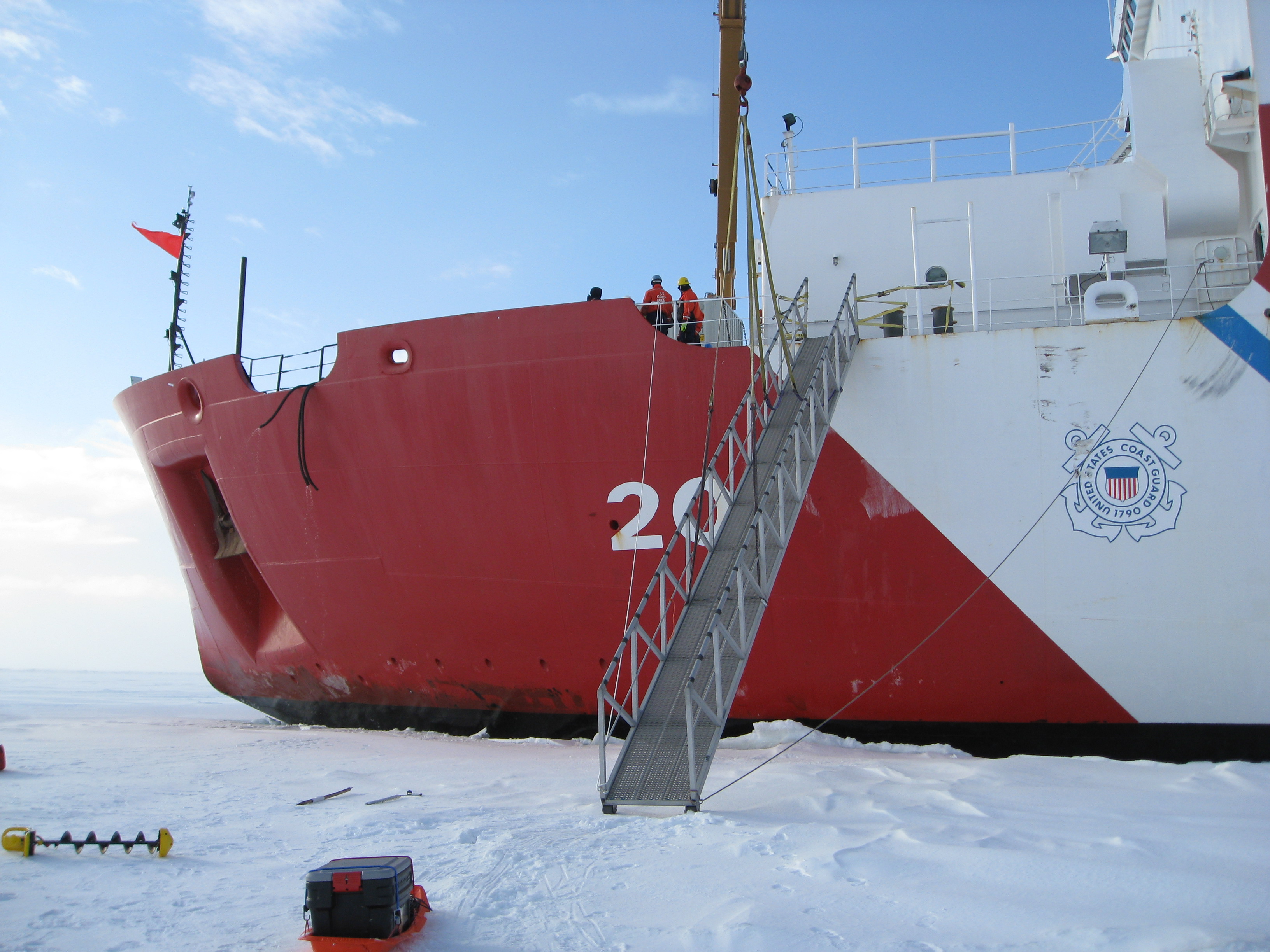 The Healy docked at an ice station. On the sea ice near the USCGC Healy icebreaker, on the Bering Sea.