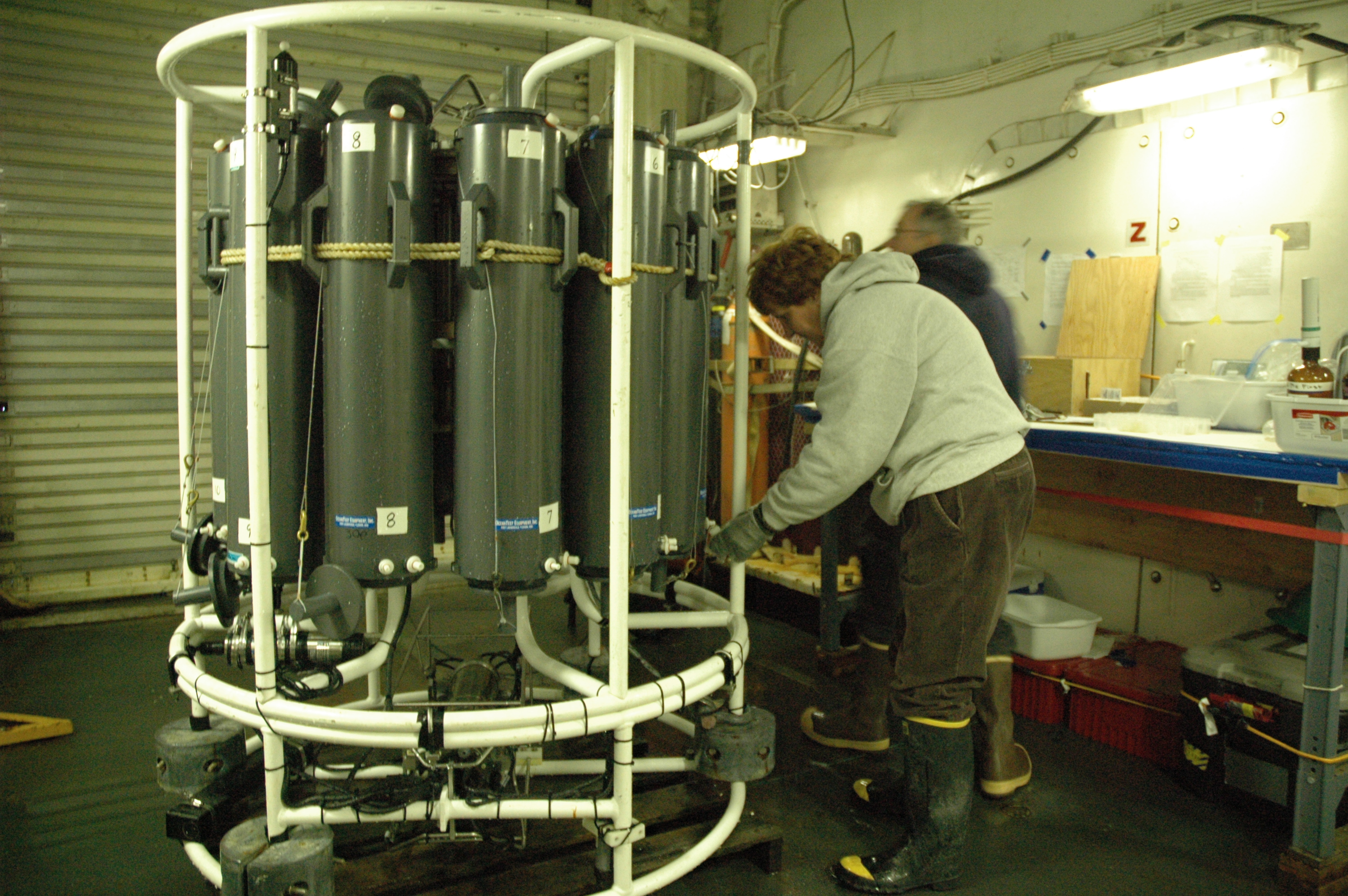 Nancy and Dave Kachel are oceanograpers in Washington. They are collecting samples from the CTD (conductivity, temperature, and depth recording instrument) to test for seven different water properties, including salt, nutrients, oxygen, carbon, and chlorophyll. Aboard the USCGC Healy icebreaker, on the Bering Sea.