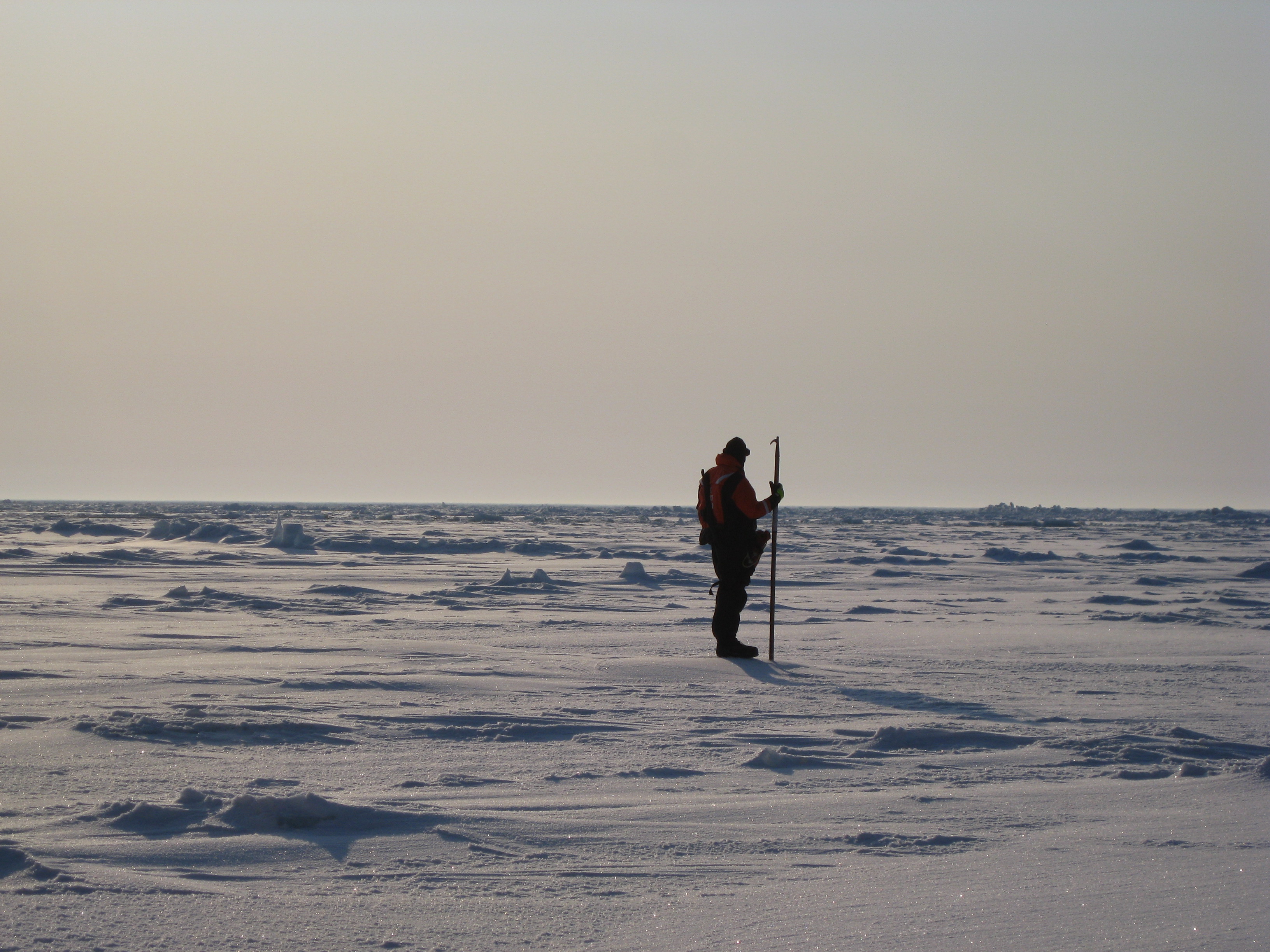 The lone bear watch stands guard while scientists work in the morning. He is constantly scanning the horizon for any unwelcome visitors that might want to show up. On the sea ice near the USCGC Healy icebreaker, on the Bering Sea.