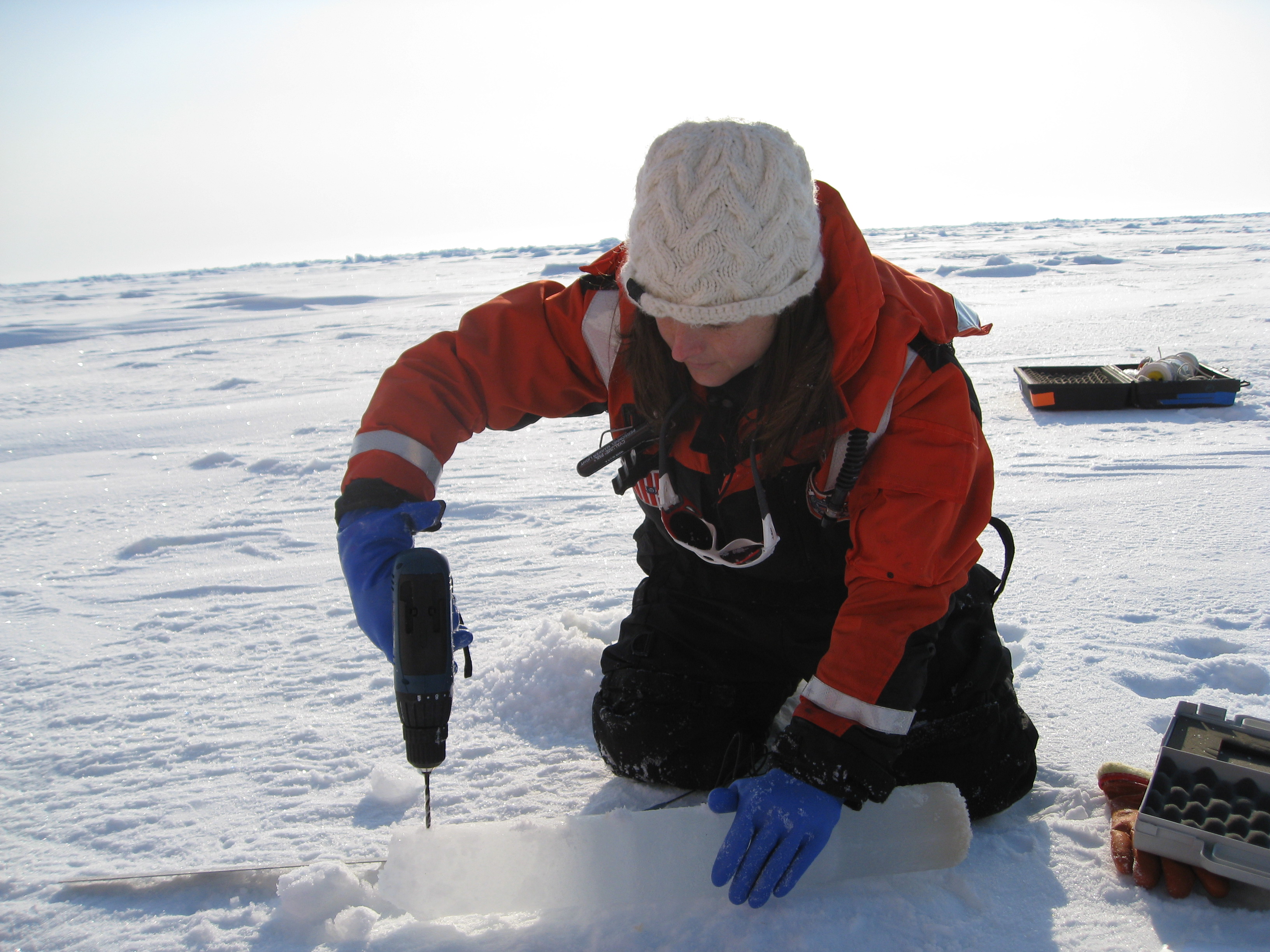 Under the supervision of Heloise Chenelot, Simone Welch drills holes every few centimeters into an ice core. These holes are used to insert a thermometer to take the temperature of the ice. On the sea ice near the USCGC Healy icebreaker, on the Bering Sea.