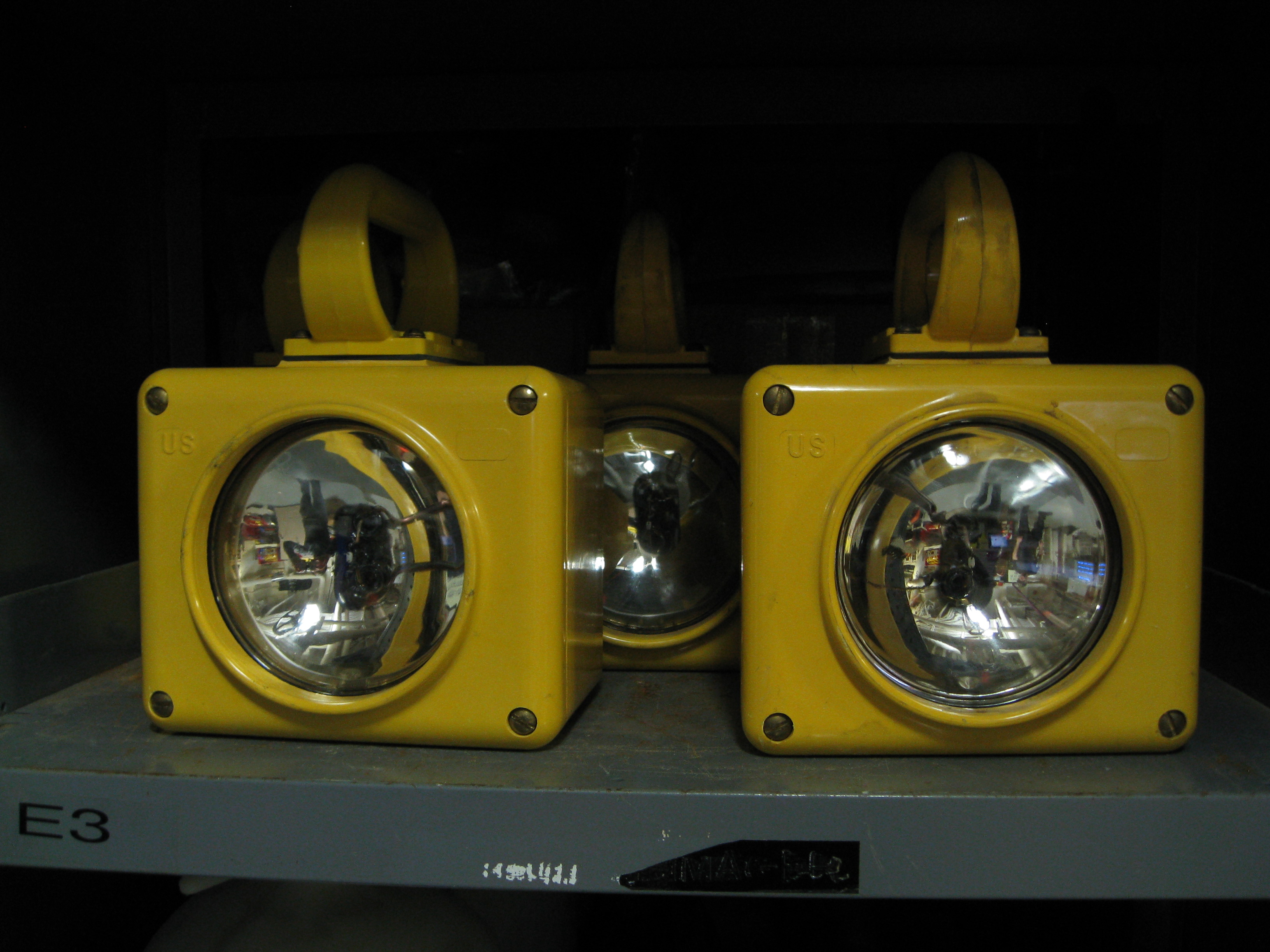 These bright yellow battle lanterns help engineers and firefighters to see in small, dark, and hard to access places. Aboard the USCGC Healy icebreaker, on the Bering Sea.