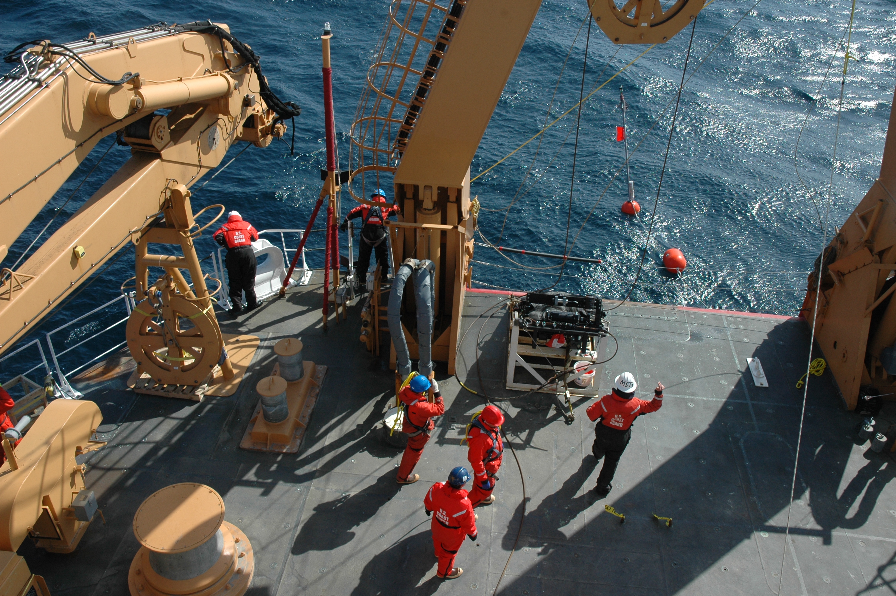 After hooking onto the traplines, Ray Mendoza leads the equipment to the back of the fantail where it can be brought safely onto the ship. Aboard the USCGC Healy icebreaker, on the Bering Sea.