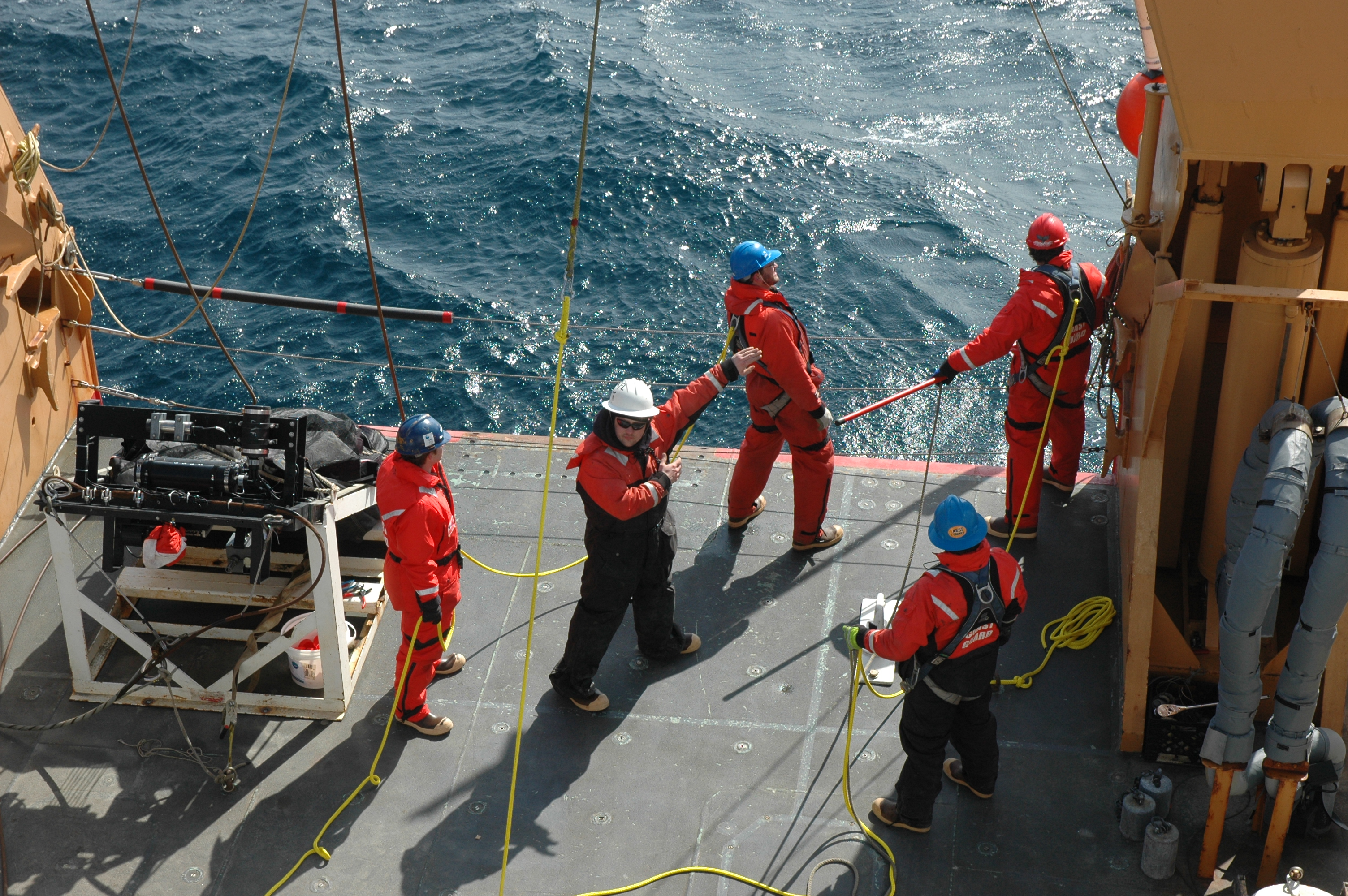 MST Rich Layman uses hand signals to communicate with the winch operator who will bring the buoys and traps out of the water. Mike Lomas and Pat Kelly are ready to guide everything safely to the deck. Doug Bell and Ray Mendoza man the safety lines that assure that Pat and Mike stay aboard the ship. Aboard the USCGC Healy icebreaker, on the Bering Sea.