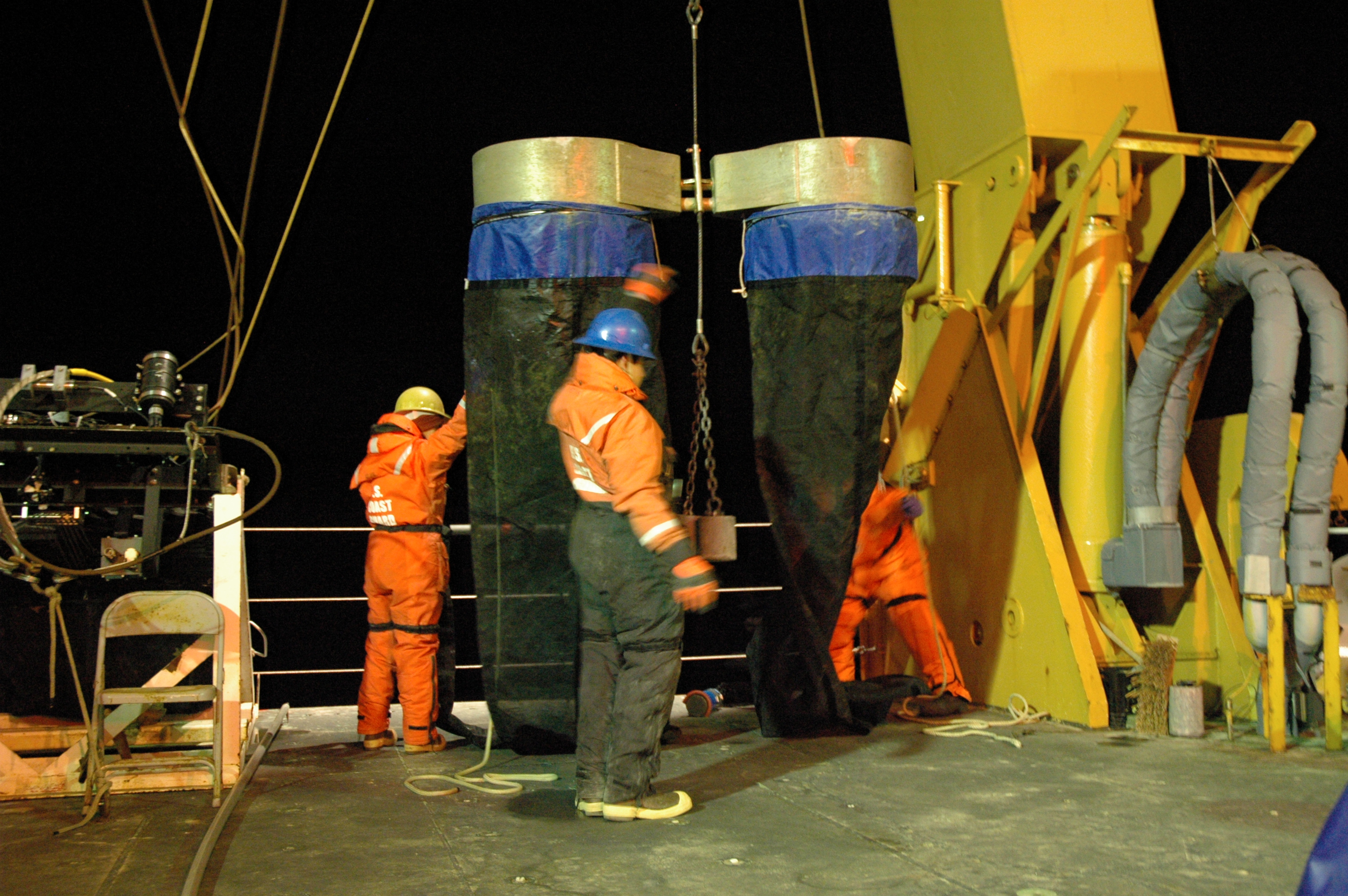 The ship moved slowly through the ice so that it could clear a trail for the bongos to be towed behind. The team caught krill and even a few jellyfish that happen to be in the way. Aboard the USCGC Healy icebreaker, on the Bering Sea.