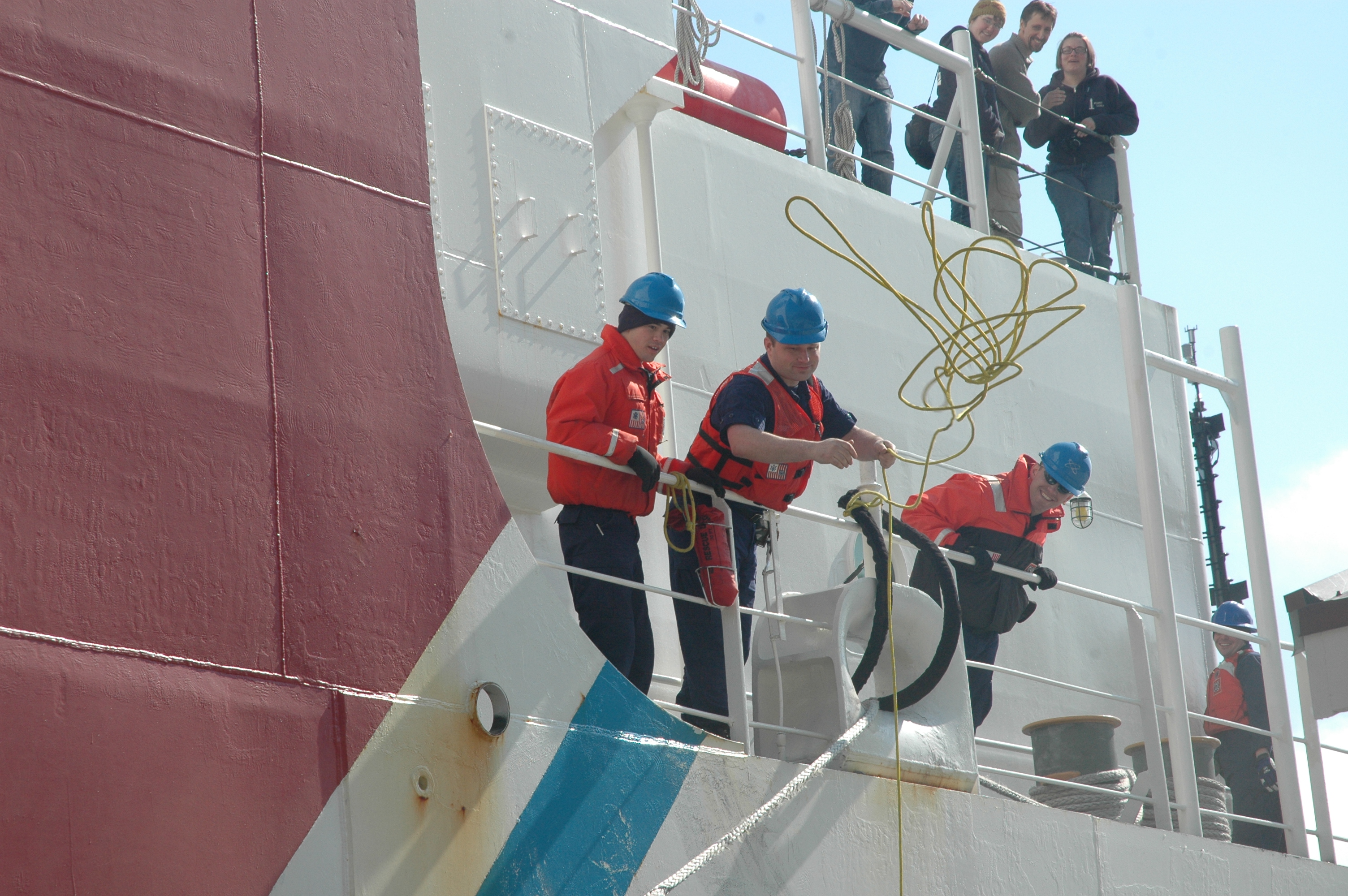 As soon as the USCGC Healy icebreaker was in place, the deck crew began tossing lines to the pier. Dutch Harbor, Unalaska, Alaska.