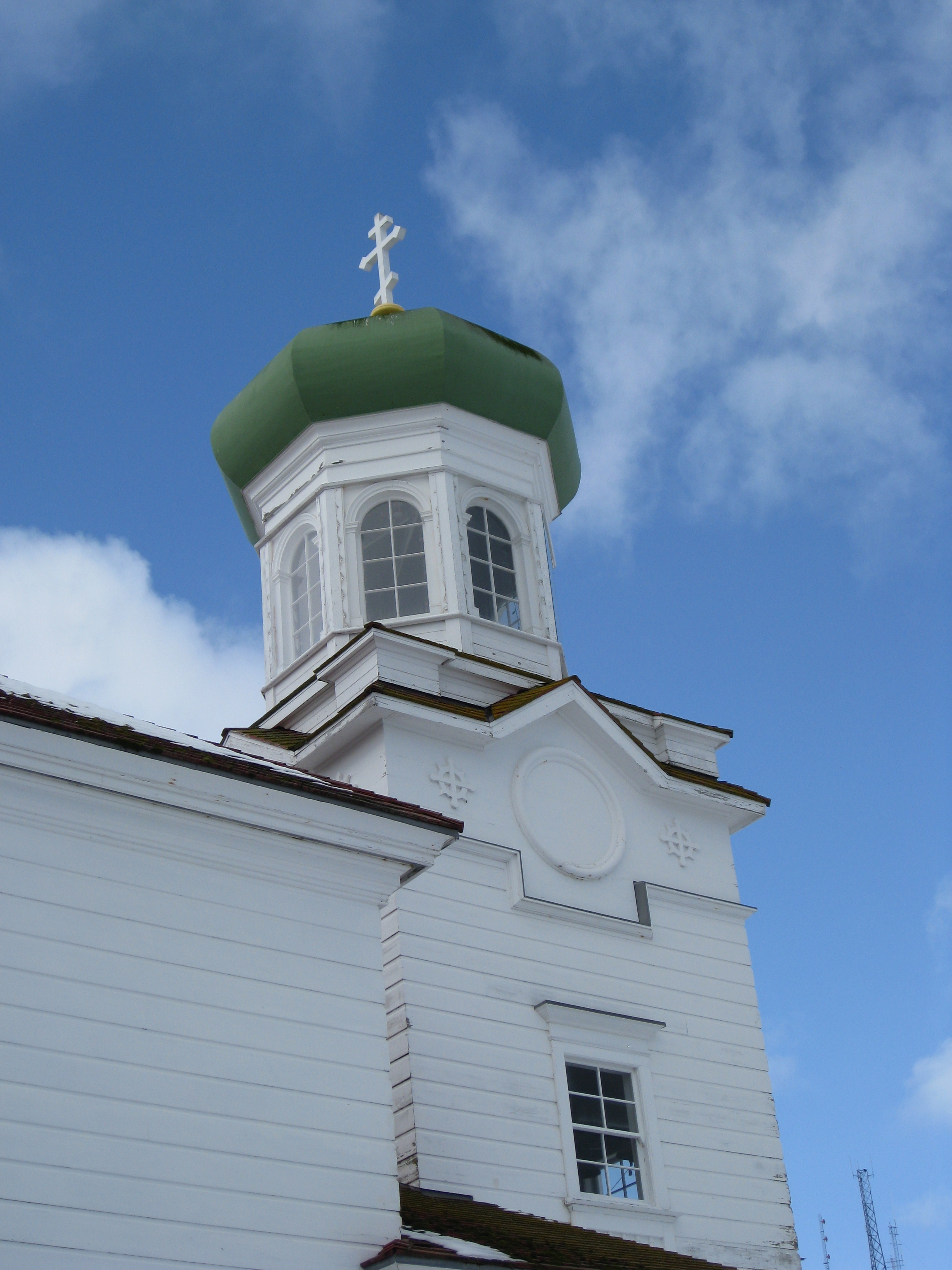 The Russian Orthodox church. In this church, men sit on one side, women on the other. In Unalaska, Alaska.