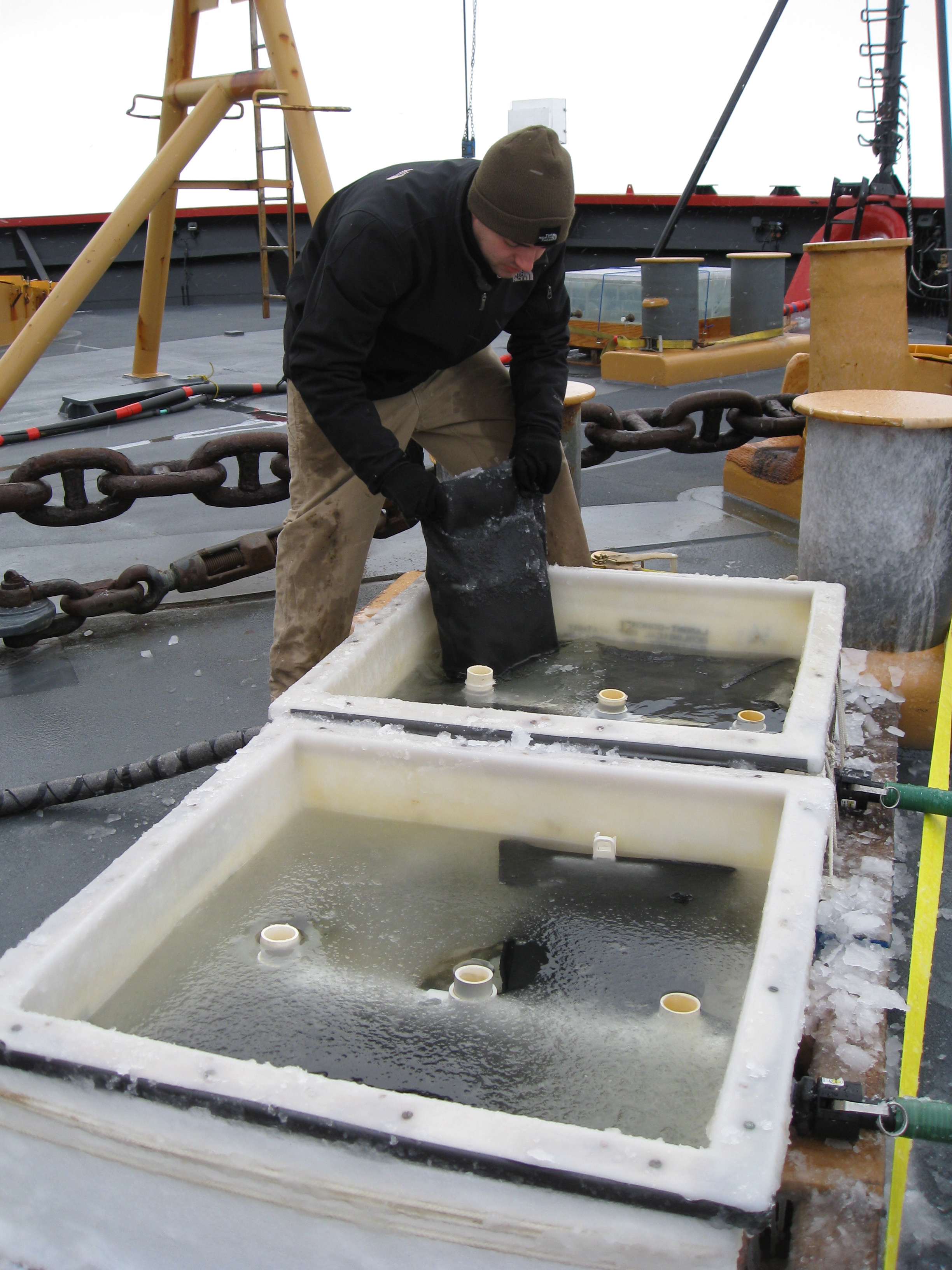 Kris Swenson lowers bottles of seawater samples into his incubator on the bow. He will be watching for changes related to the phytoplankton over time. Aboard the USCGC Healy icebreaker, on the Bering Sea.