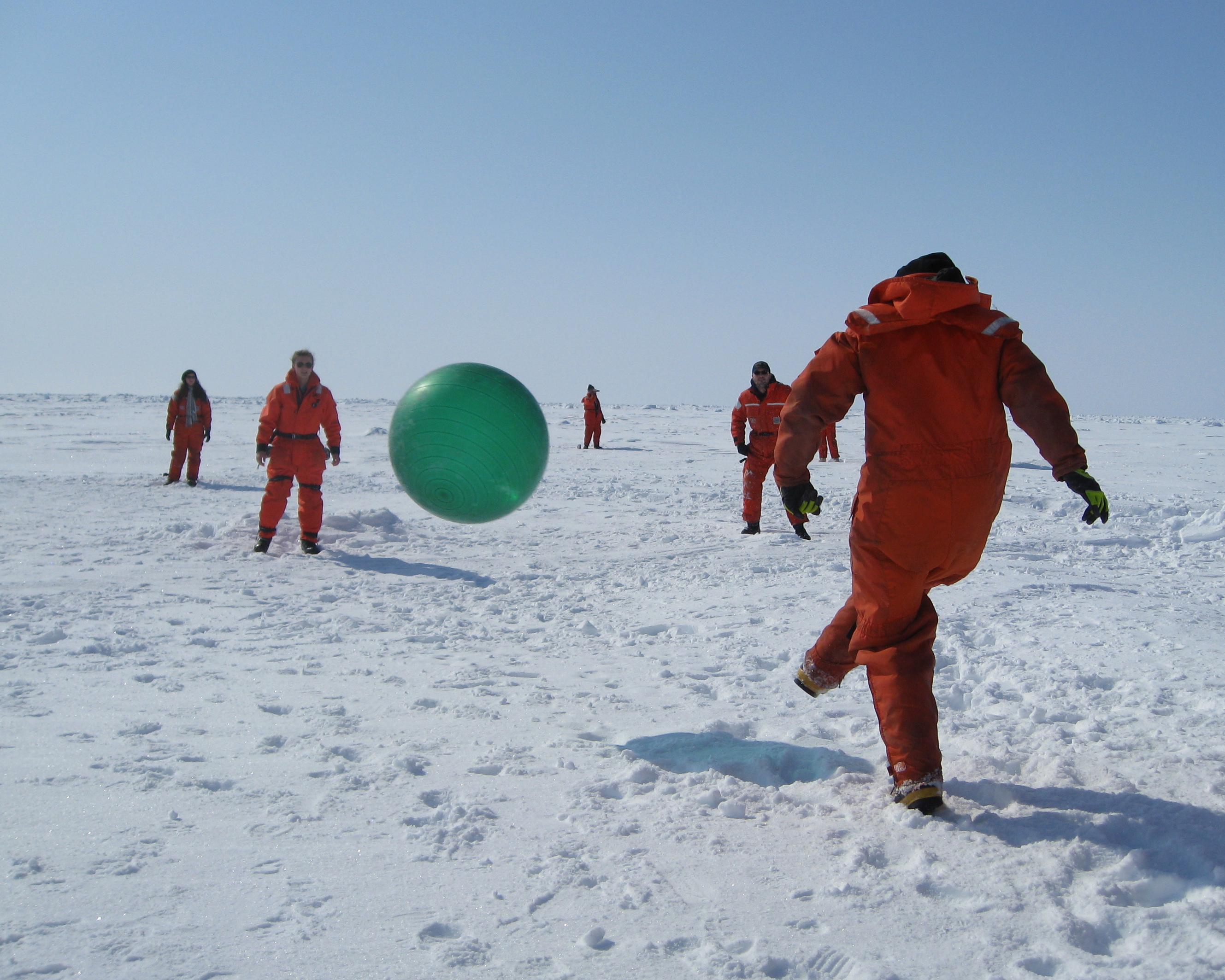 Simone Welch: "Well, sort of. The ball was bigger, the players were clumsier, and the bases were snow mounds, but kickball it was!" On the sea ice near the USCGC Healy icebreaker, on the Bering Sea.