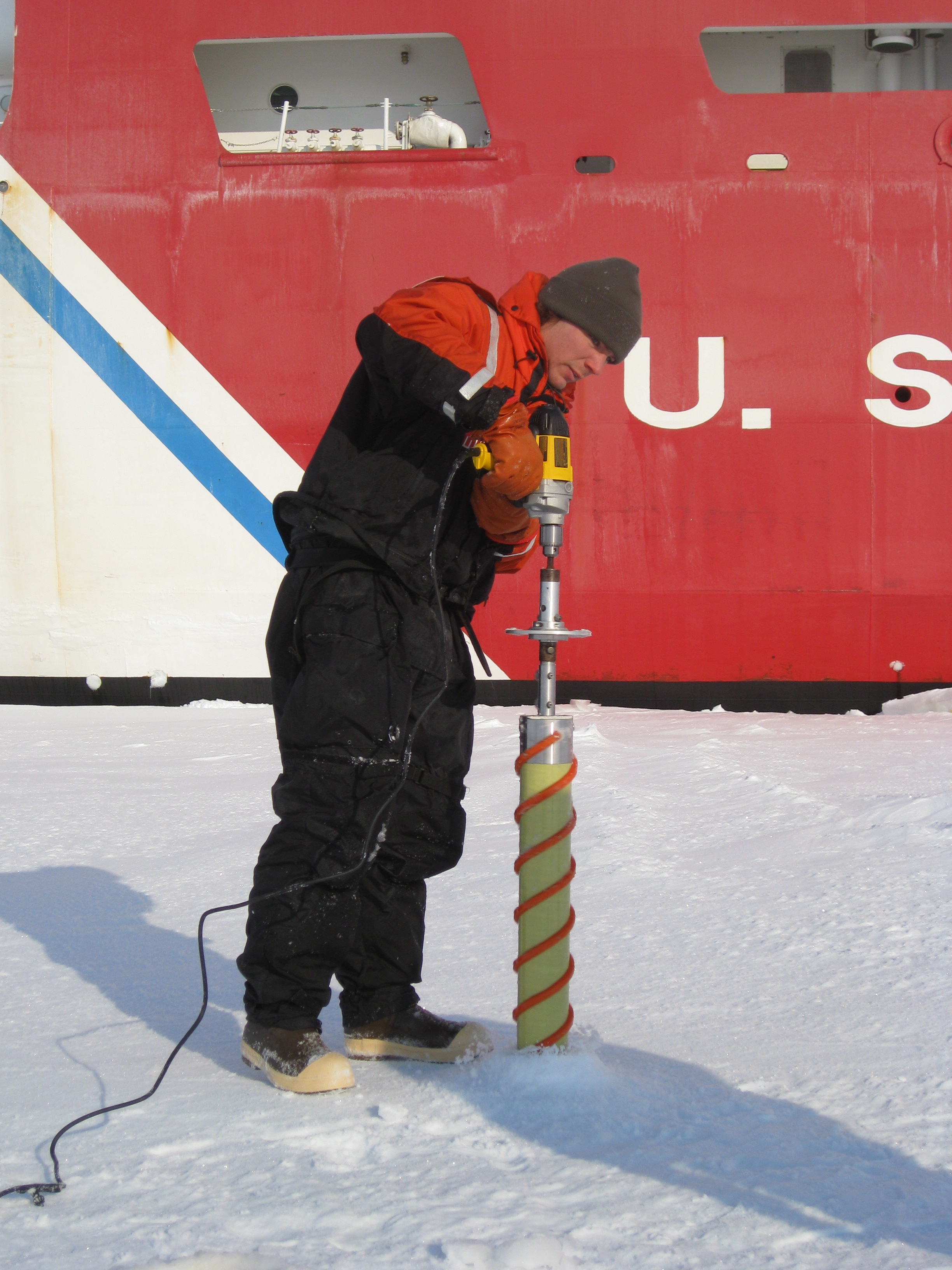 Jared Weems operates the corer. The chamber will cut a cylinder that can then be used for sampling. On the sea ice near the USCGC Healy icebreaker, on the Bering Sea.