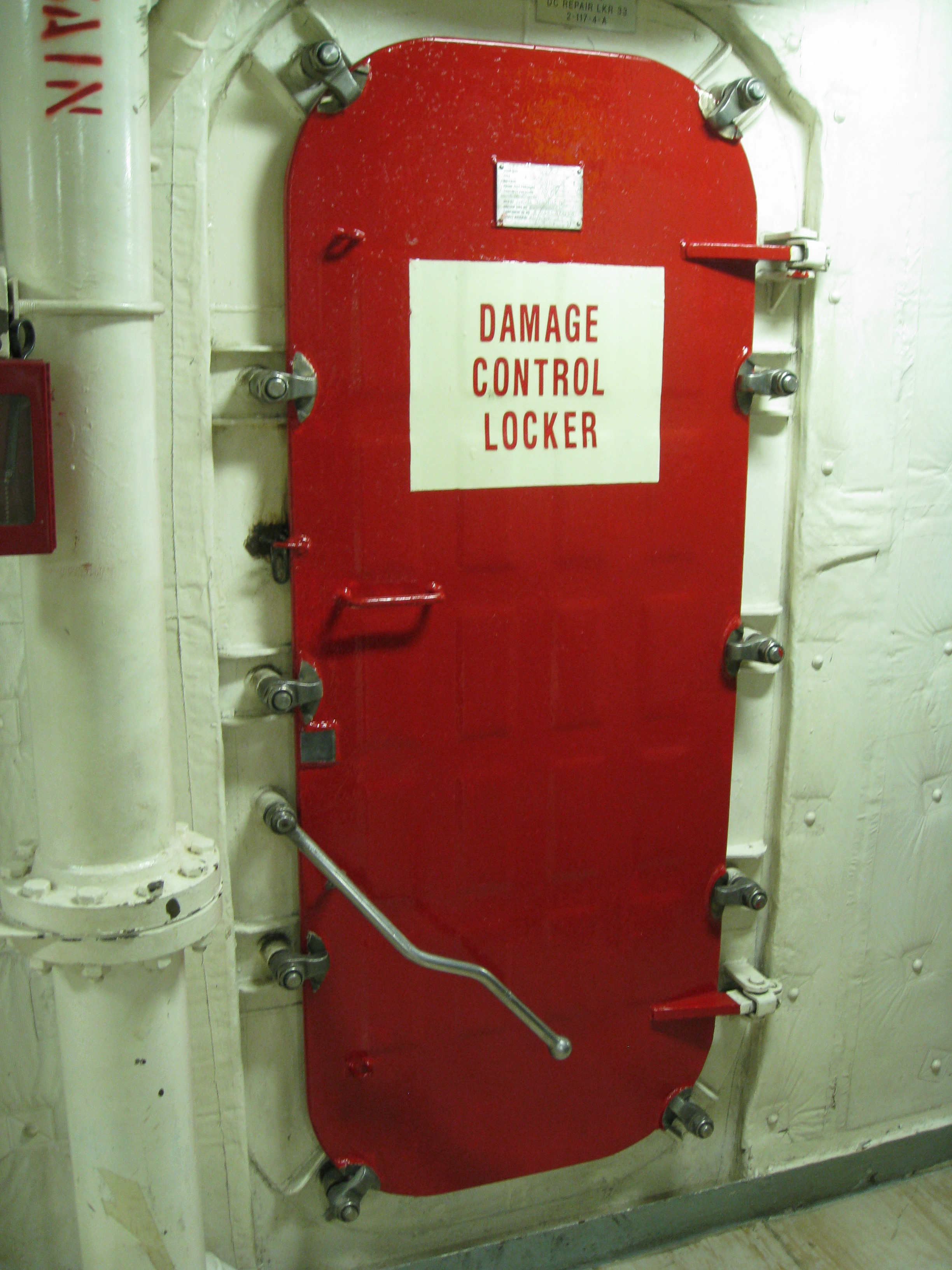Behind this door there is a room full of emergency equipment. These rooms are the firehouses of the Healy. Aboard the USCGC Healy icebreaker, on the Bering Sea.