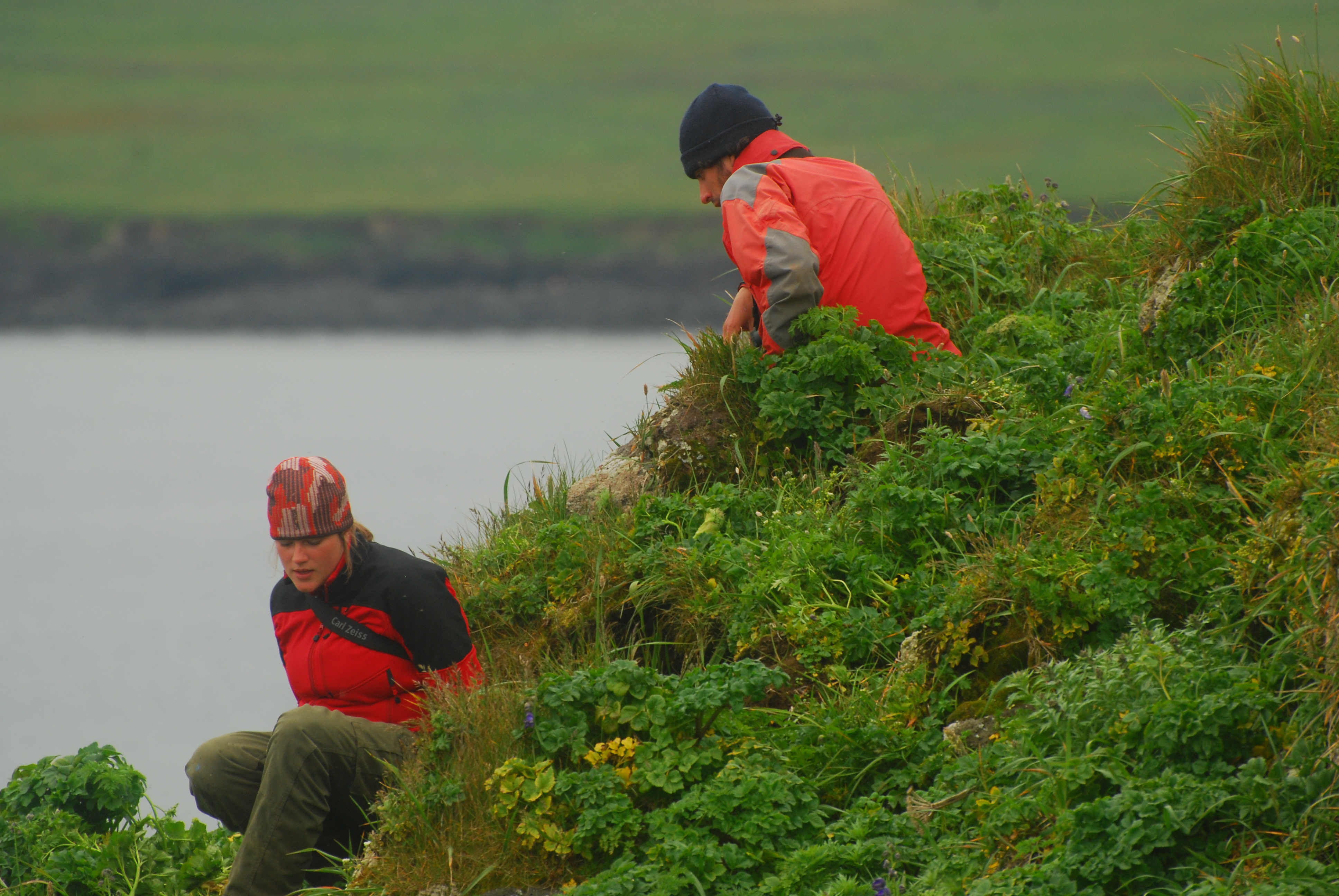 Ine Dorrestejn and Thibaut Vergoz near the ridge wall. Saint Paul Island, Pribilof Islands, Alaska.