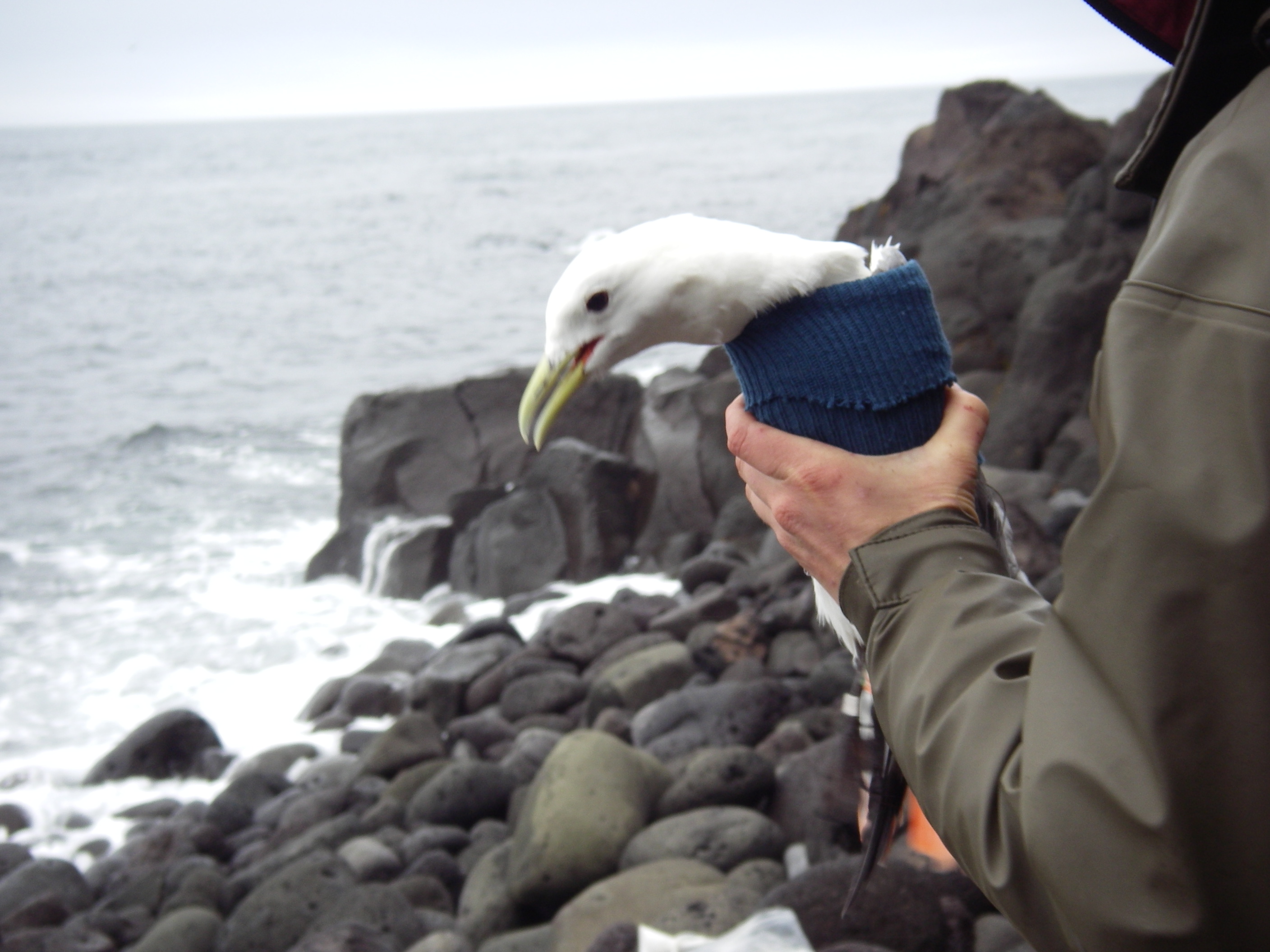 Kittiwake secured in a sock. Saint Paul Island, Pribilof Islands, Alaska.