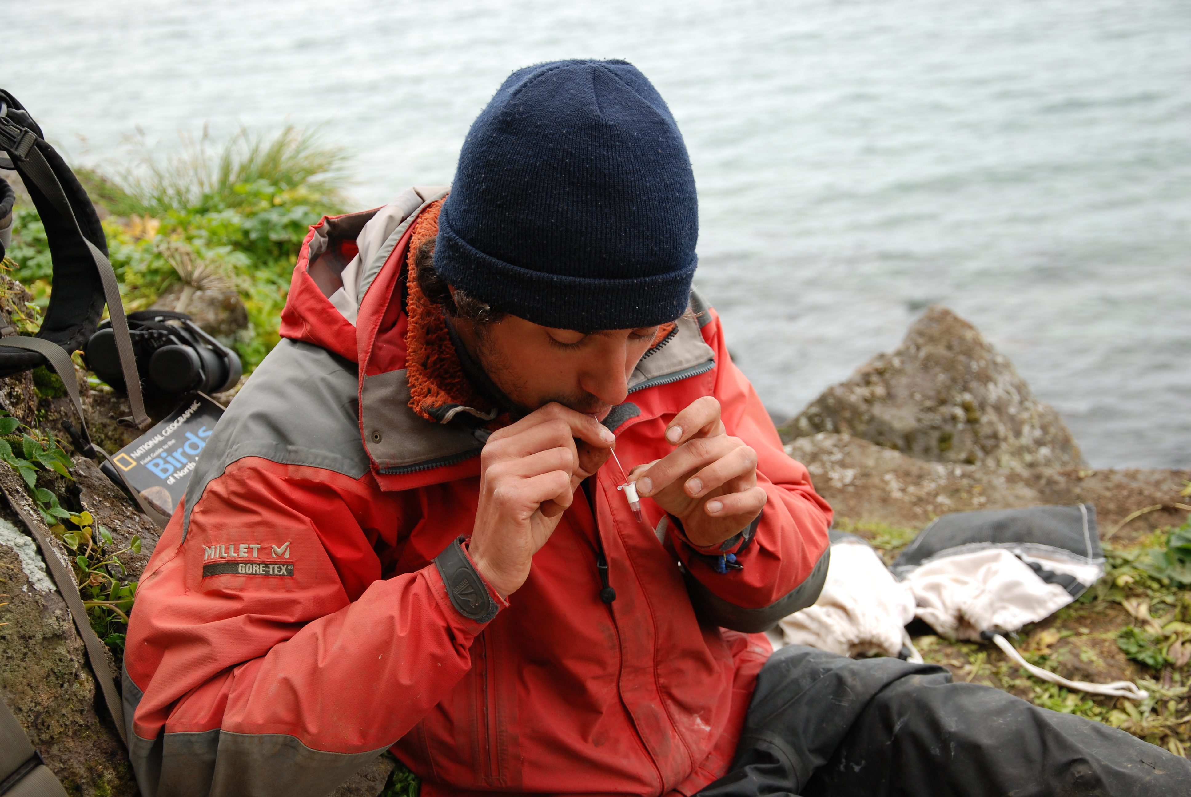 Thibaut Vergoz pipettes blood into a vial. Saint Paul Island, Pribilof Islands, Alaska.