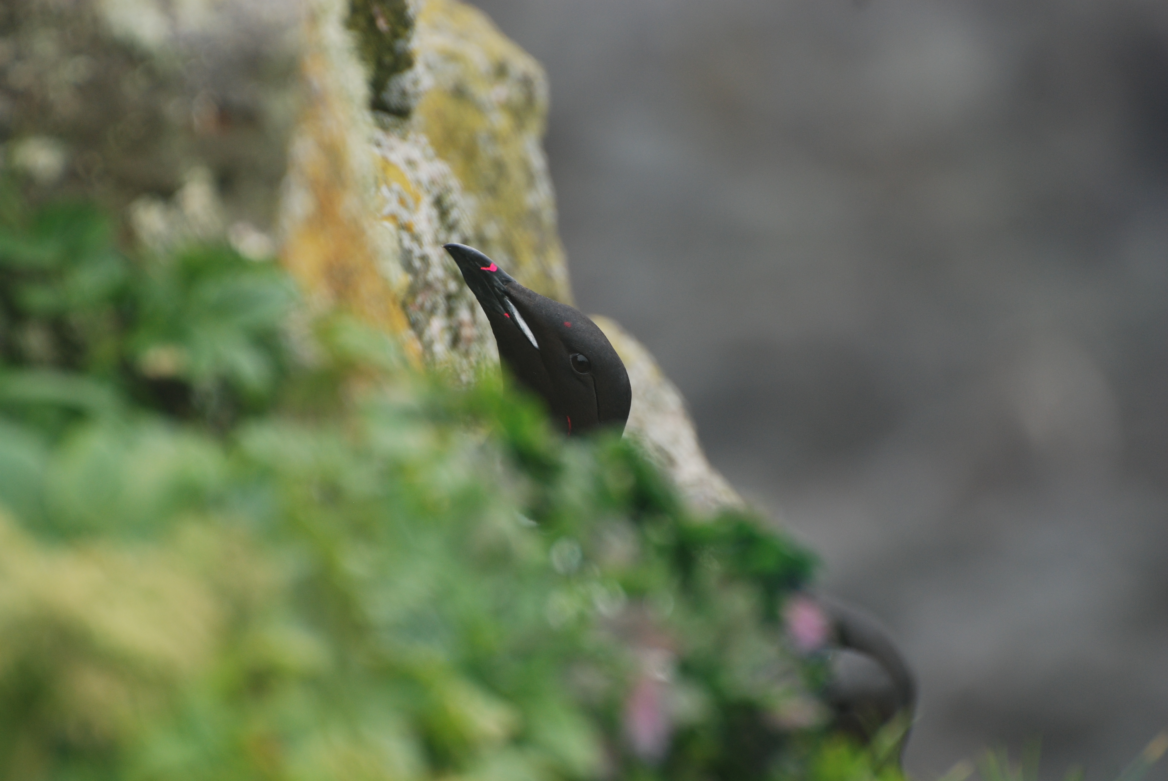 A Thick-billed Murre with a new pink dot on its beak. The pink dots are made by scientists to keep track of the birds. Saint Paul Island, Pribilof Islands, Alaska.