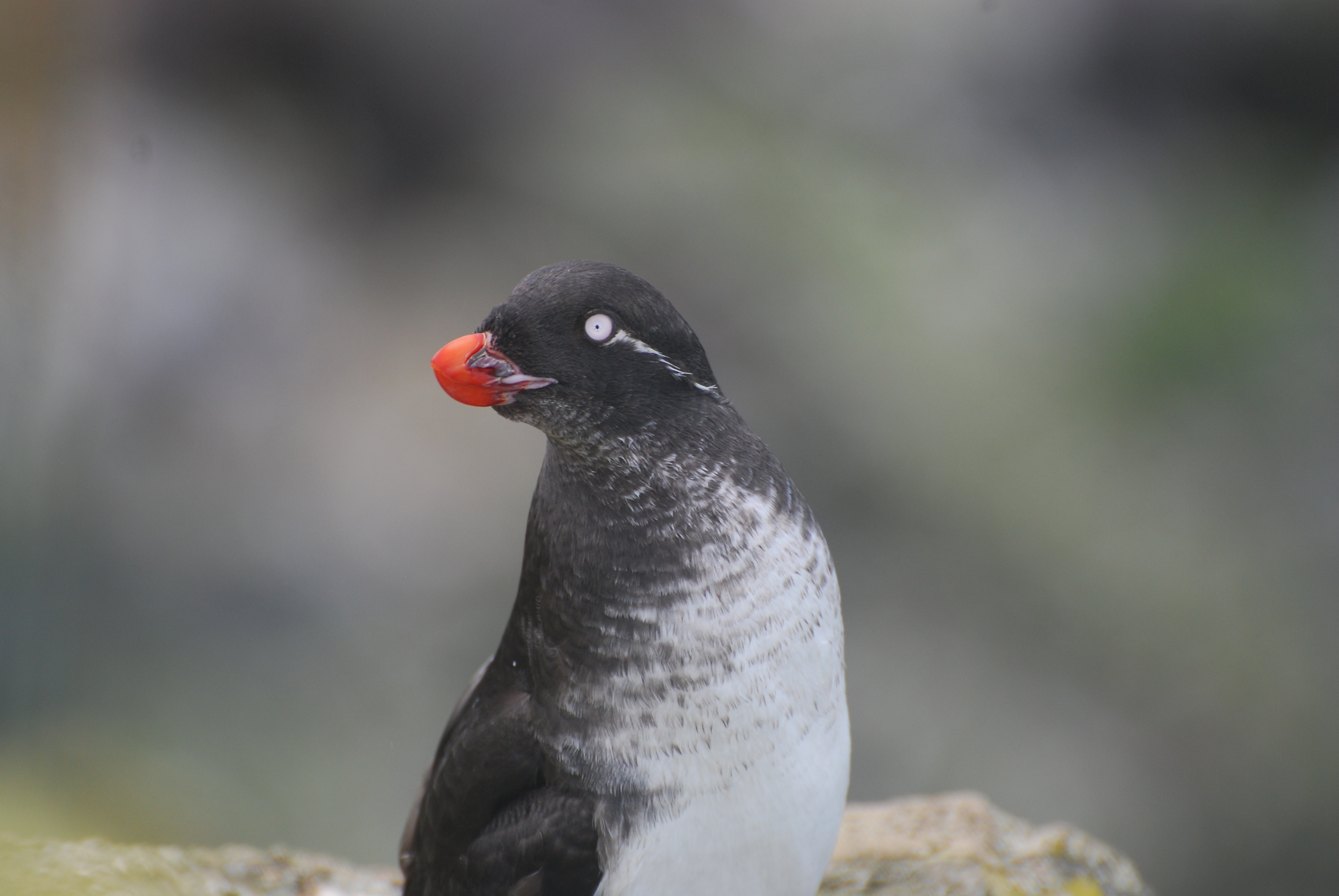 A Parakeet Auklet, a black and white seabird. Saint Paul Island, Pribilof Islands, Alaska.
