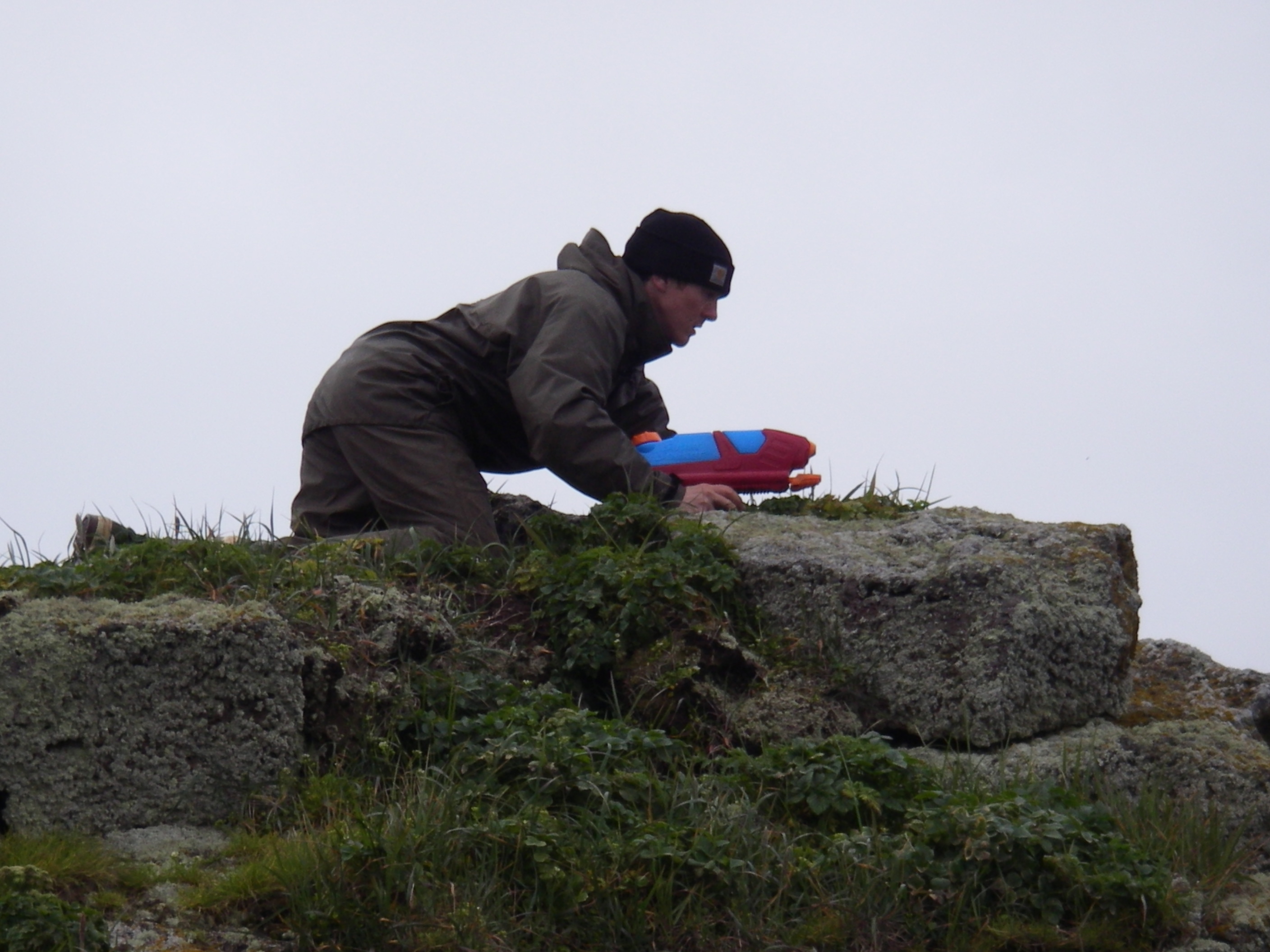 John Warzybok stalking a bird to shoot with his Super Soaker full of dye. Saint Paul Island, Pribilof Islands, Alaska.
