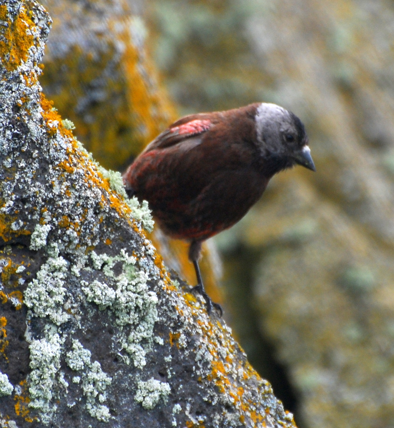 Gray-crowned Rosy Finch, a small gray and reddish bird. Saint Paul Island, Pribilof Islands, Alaska.
