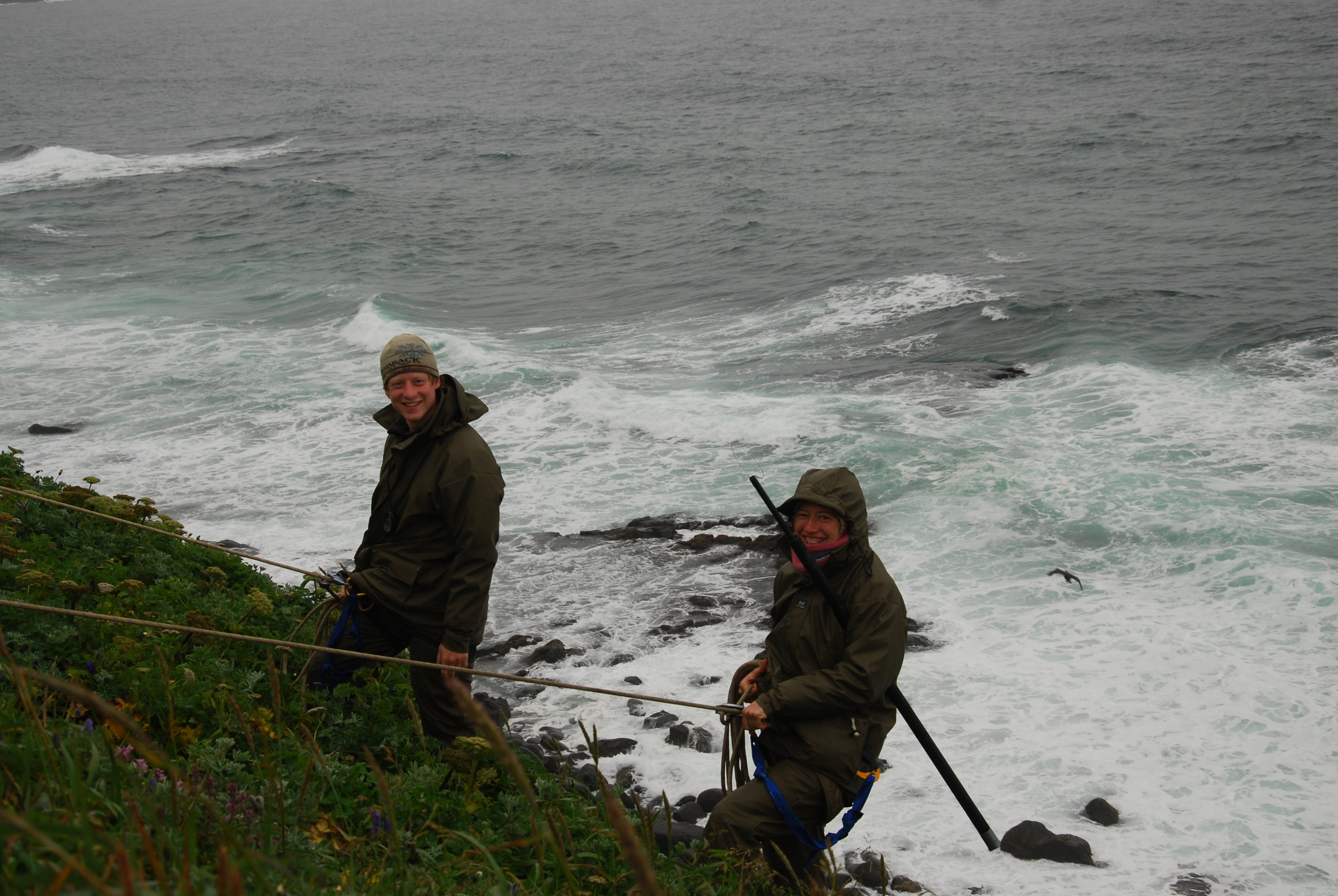 Dan Cushing and Rachael Orben begin their descent of the cliff. Saint Paul Island, Pribilof Islands, Alaska.