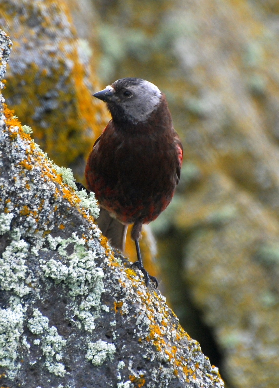 A Gray-crowned Rosy Finch perched on a lichen covered rock. Saint Paul Island, Pribilof Islands, Alaska.