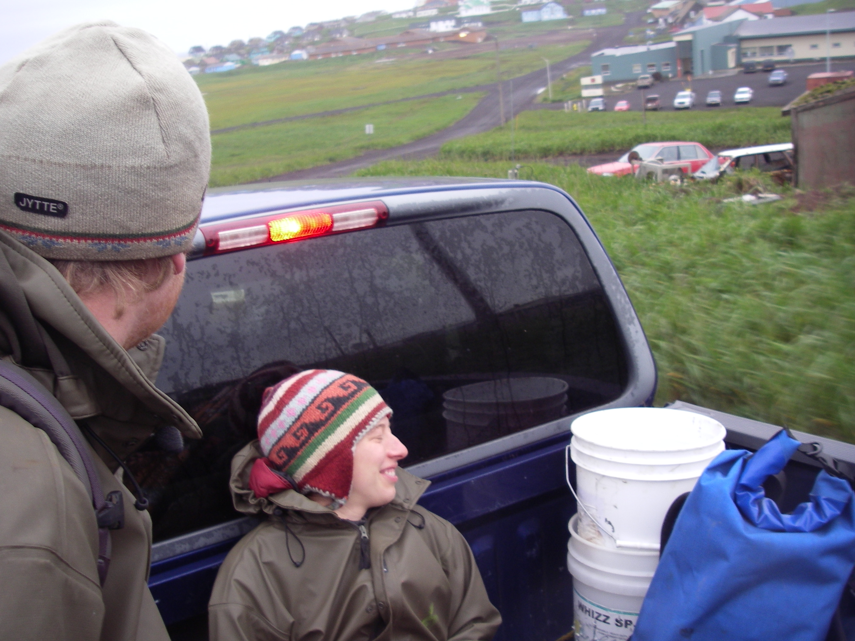 Scientists in the back of a truck. Saint Paul Island, Pribilof Islands, Alaska.
