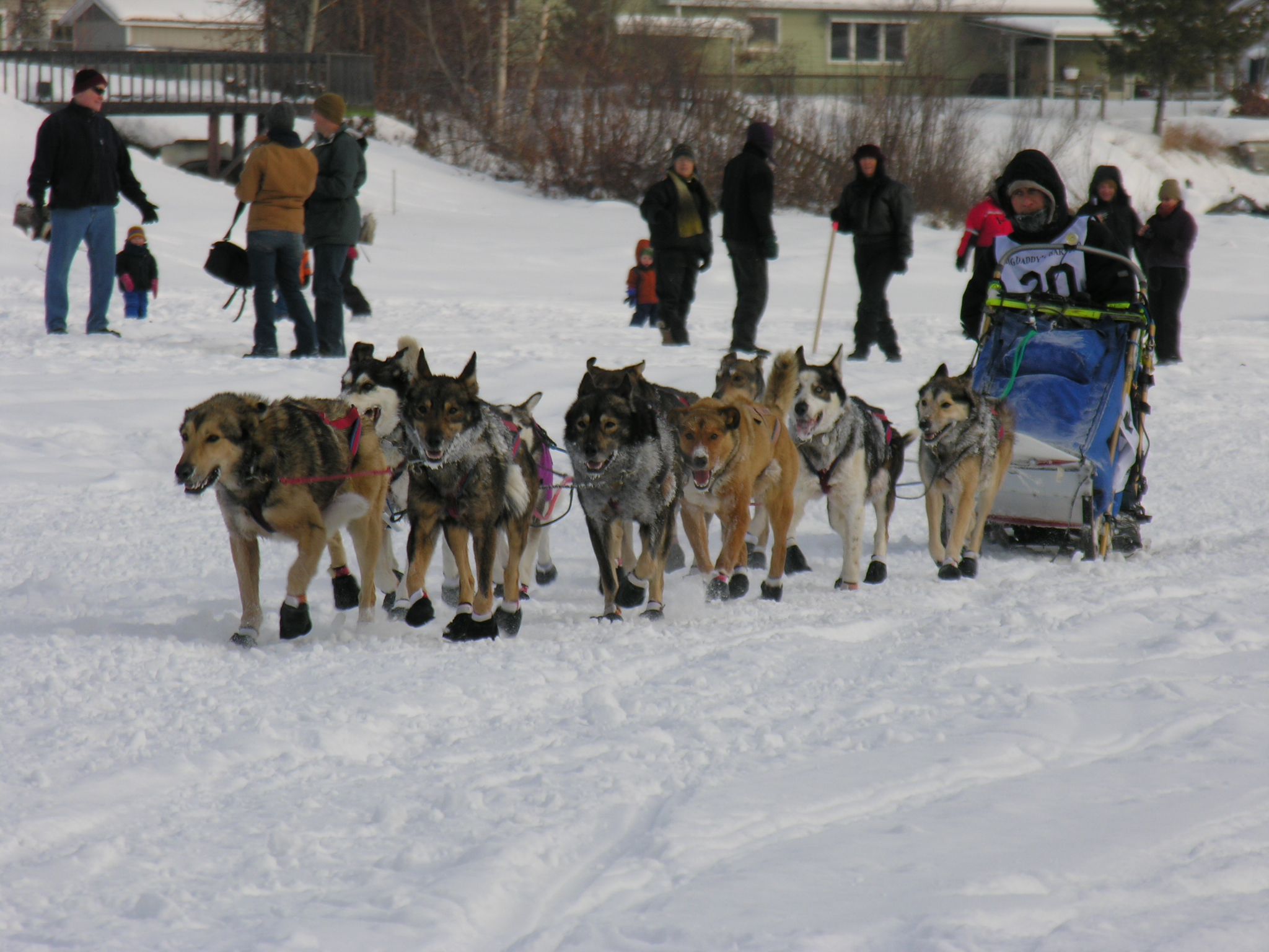 Sebastian Schnulle wins the 2009 Yukon Quest sled dog race. On the Chena River in Fairbanks, Alaska.