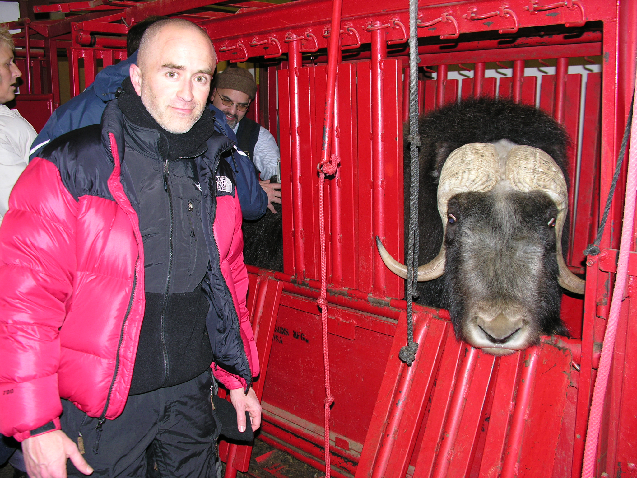 Tim Martin poses with a muskox at the University of Alaska Fairbanks' Robert G. White Large Animal Research Station.