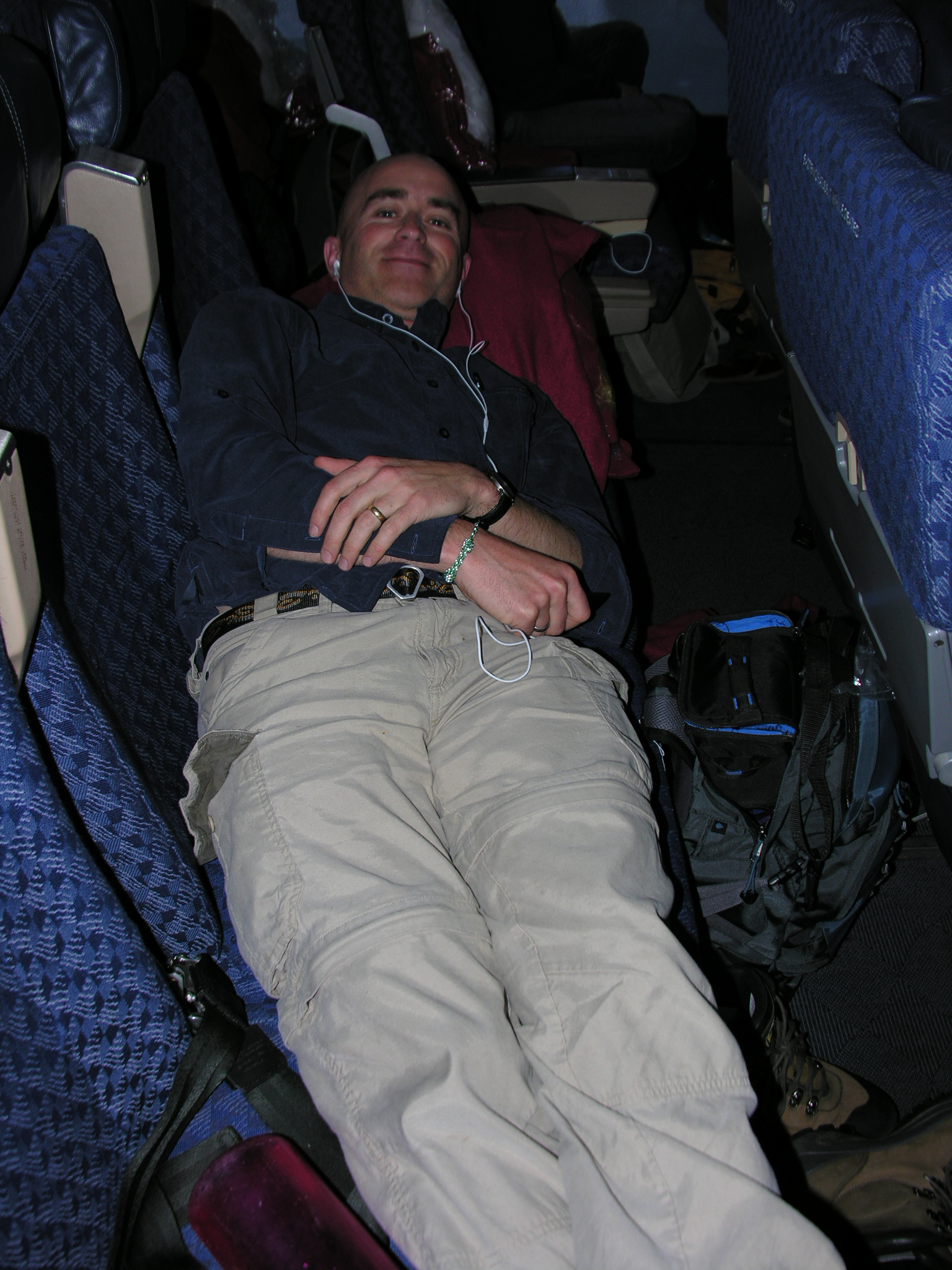 Tim Martin stretches out across three seats on his flight from Chicago to Moscow. In the air over the North Atlantic.
