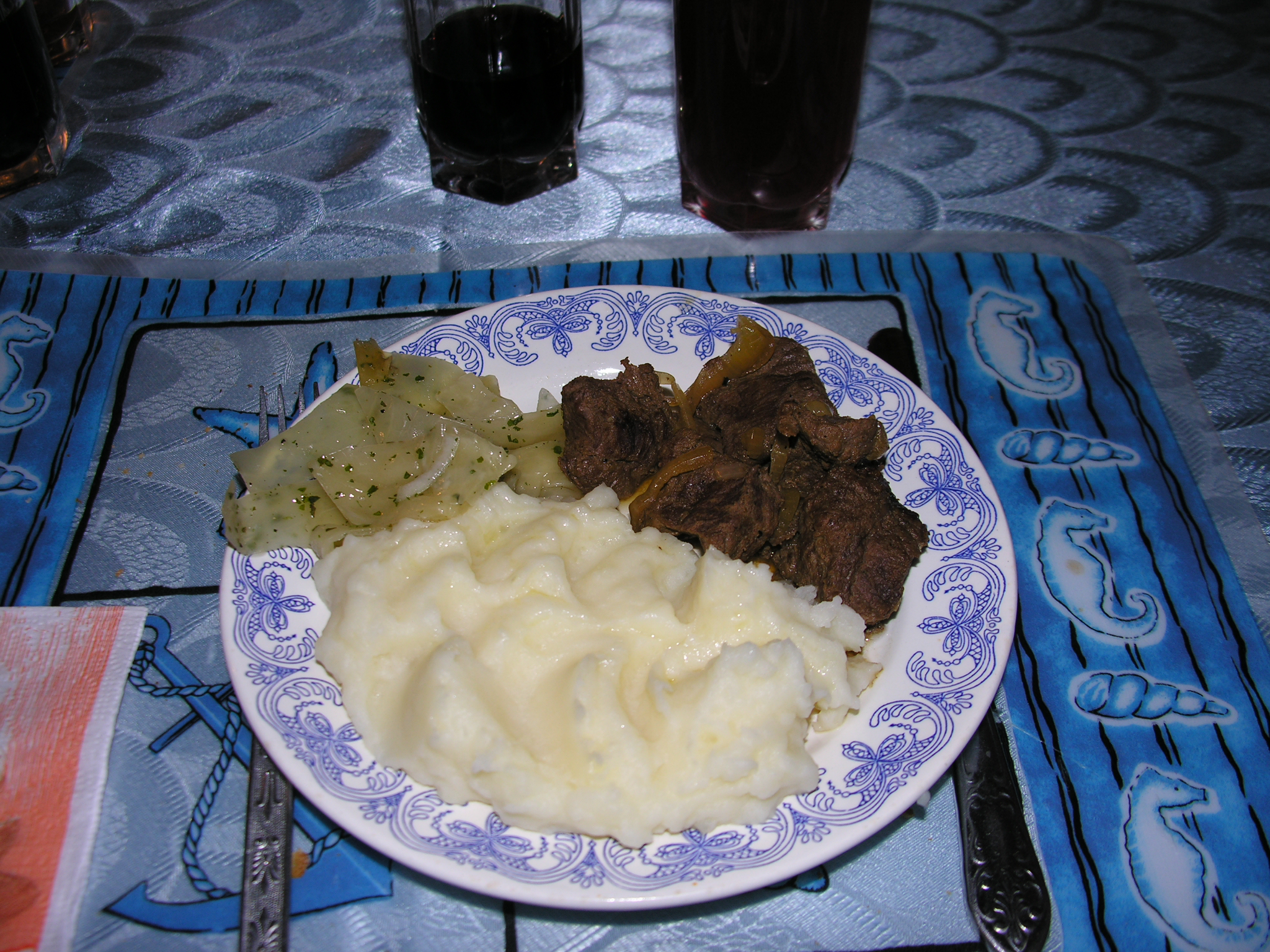 Mashed potatoes and reindeer for dinner at Pevek's only restaurant. Pevek Restaurant in Pevek, Russia.