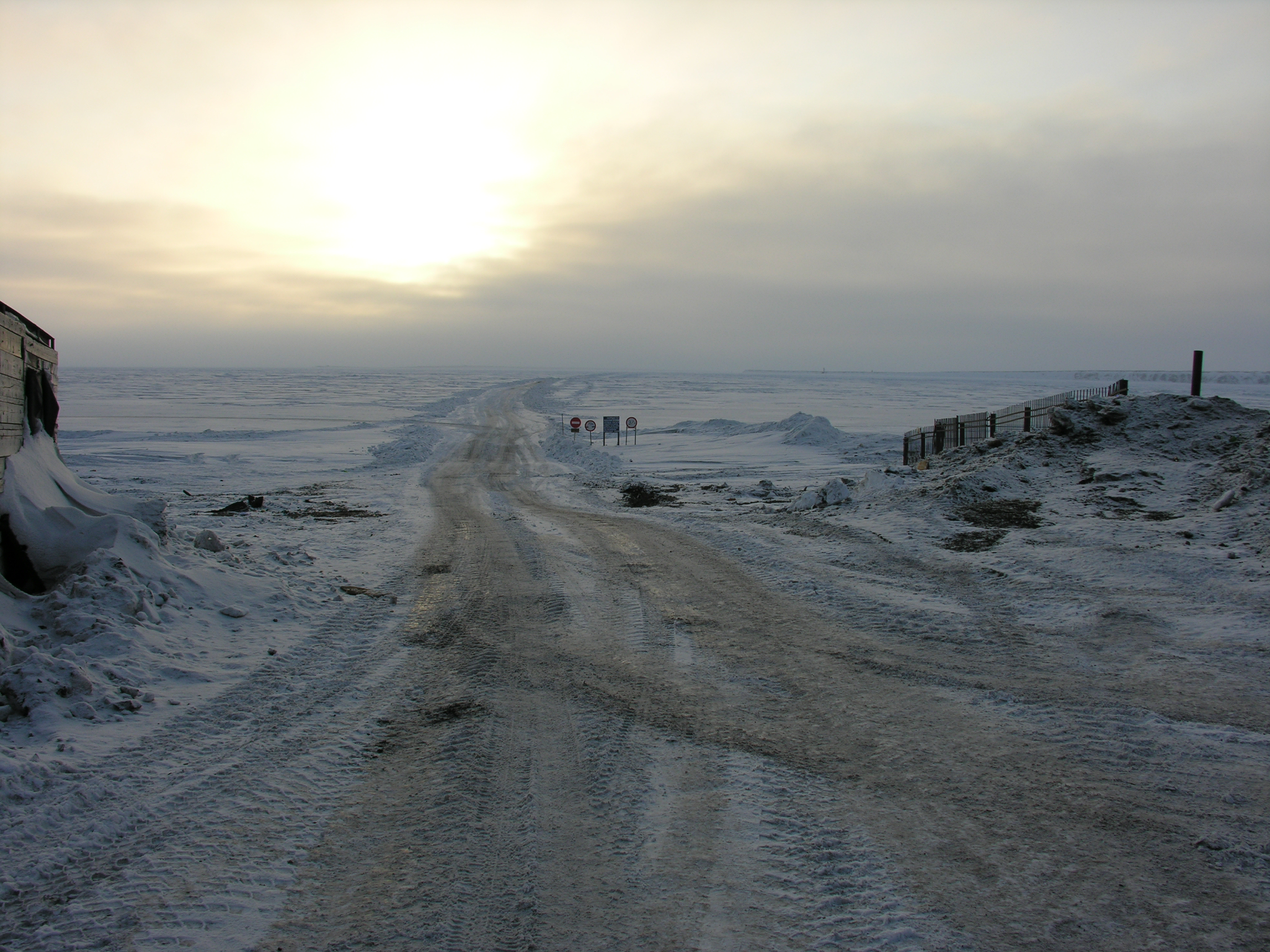 An ice road from Pevek out to an island. Pevek Harbor in Pevek, Russia.