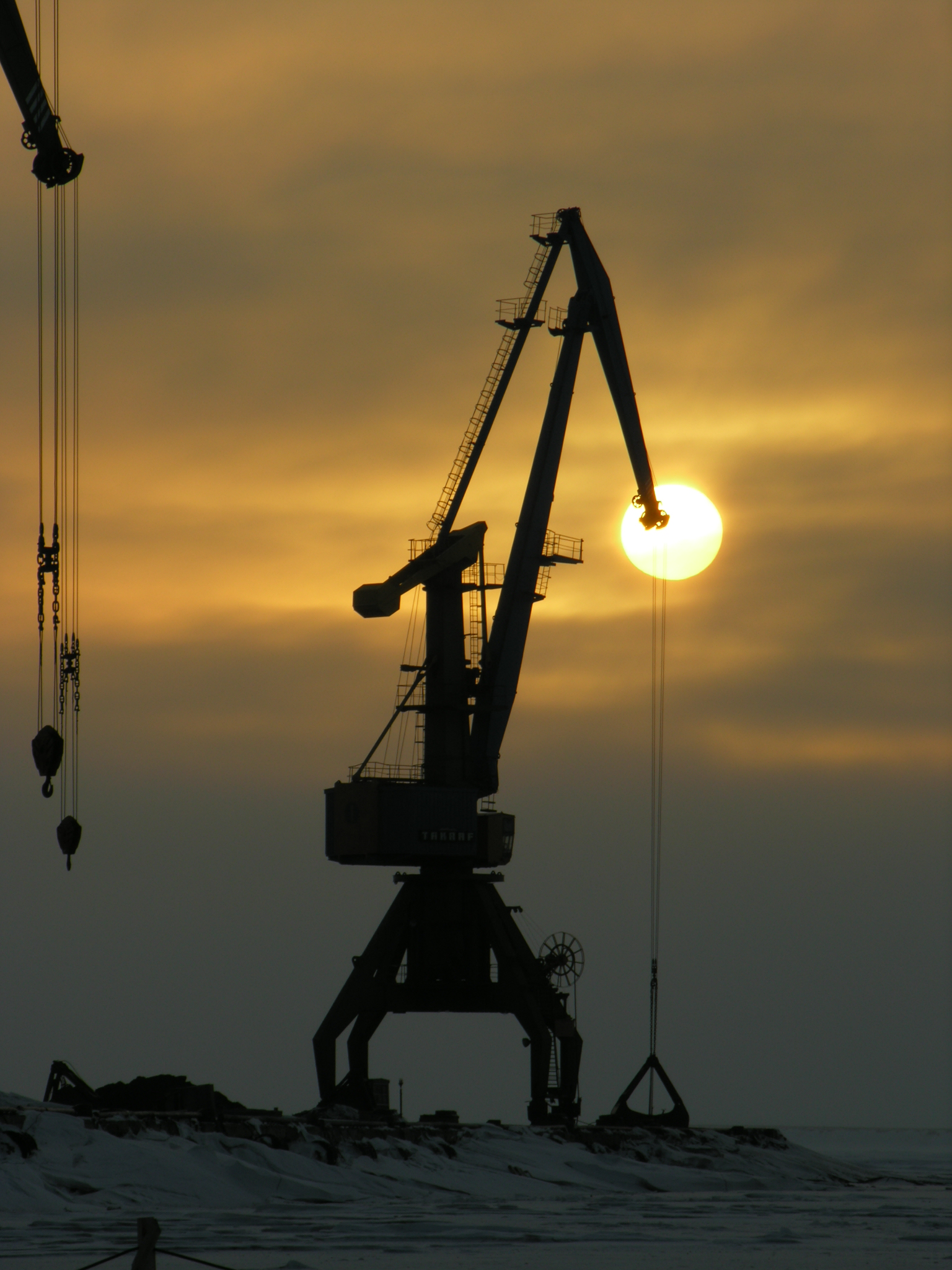 Sunset behind a coal crane in Pevek Harbor in Pevek, Russia.