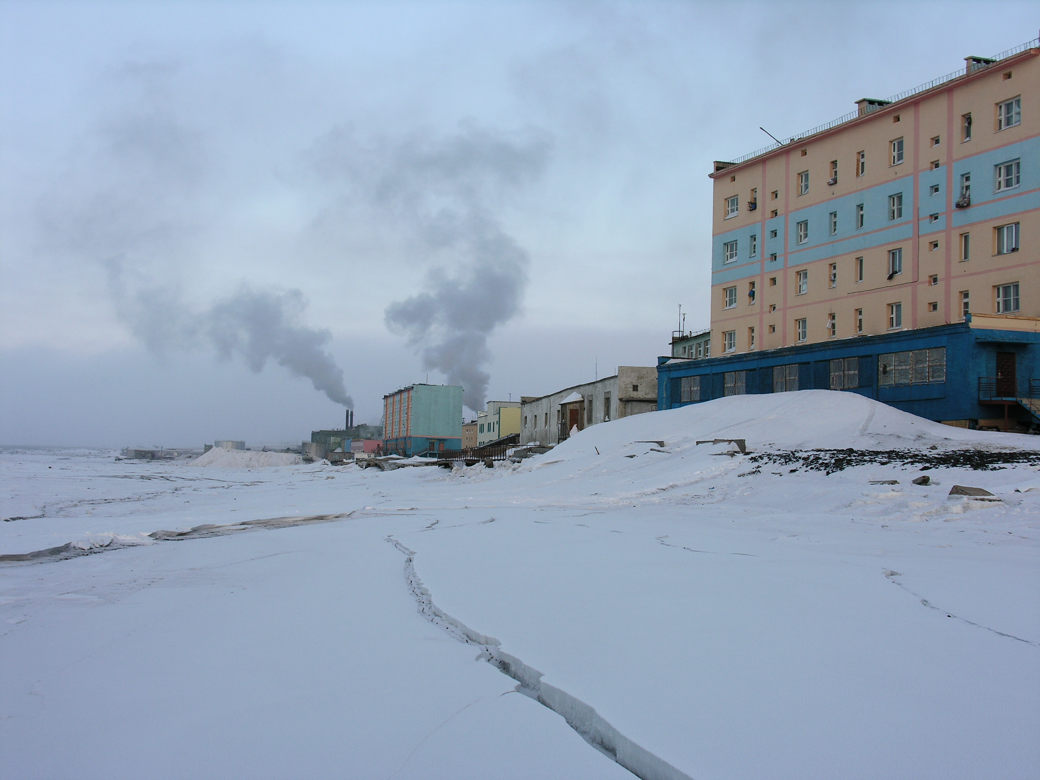 Buildings at the Pevek waterfront, and a power plant in the background. Pevek Harbor in Pevek, Russia.