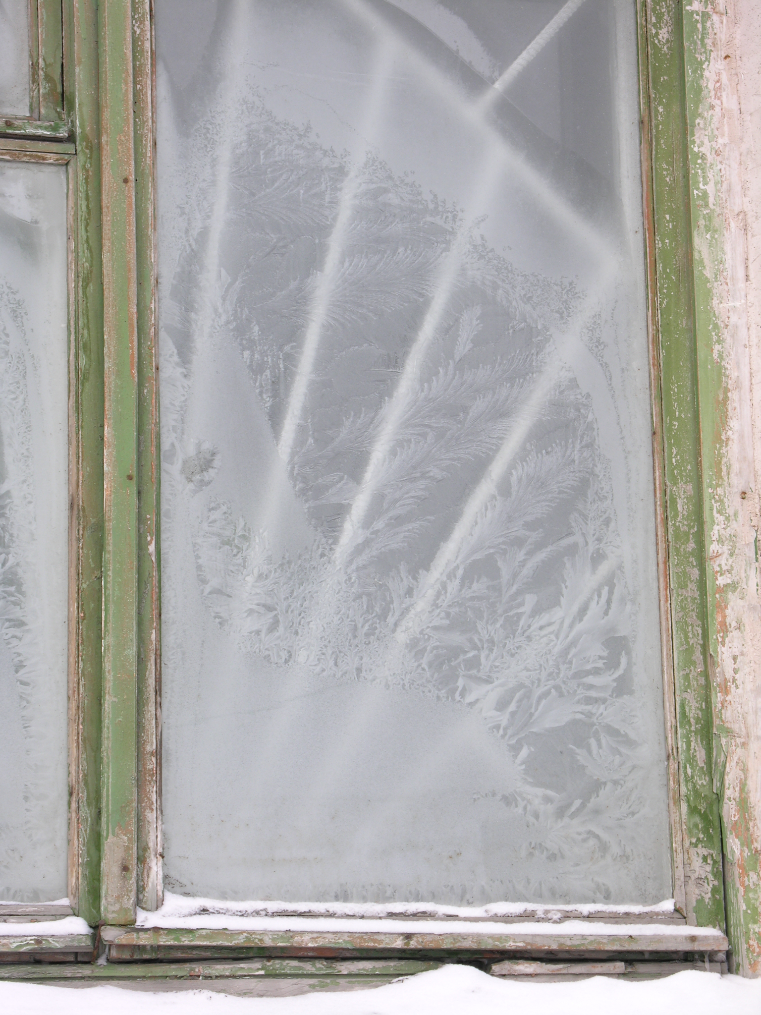 Frost crystals decorate a window in a shop in Pevek, Russia.
