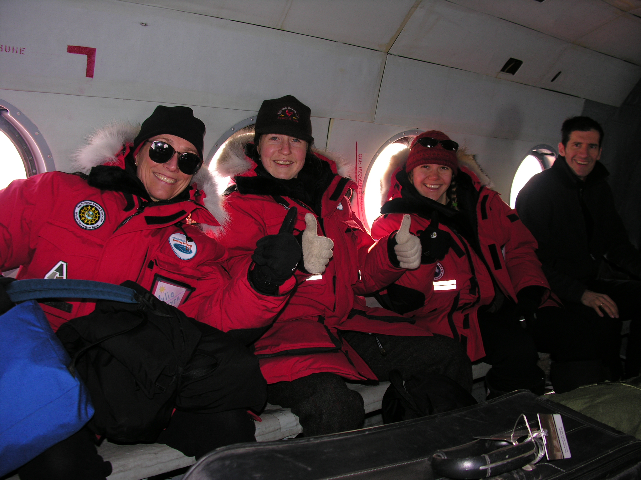 Dr. Julie Brigham-Grette, Addie Holland, and Kristina Brady on board the helicopter for the flight to the field camp. Aboard a helicopter en route to Camp El'gygytgyn, Chukotka, Russia.