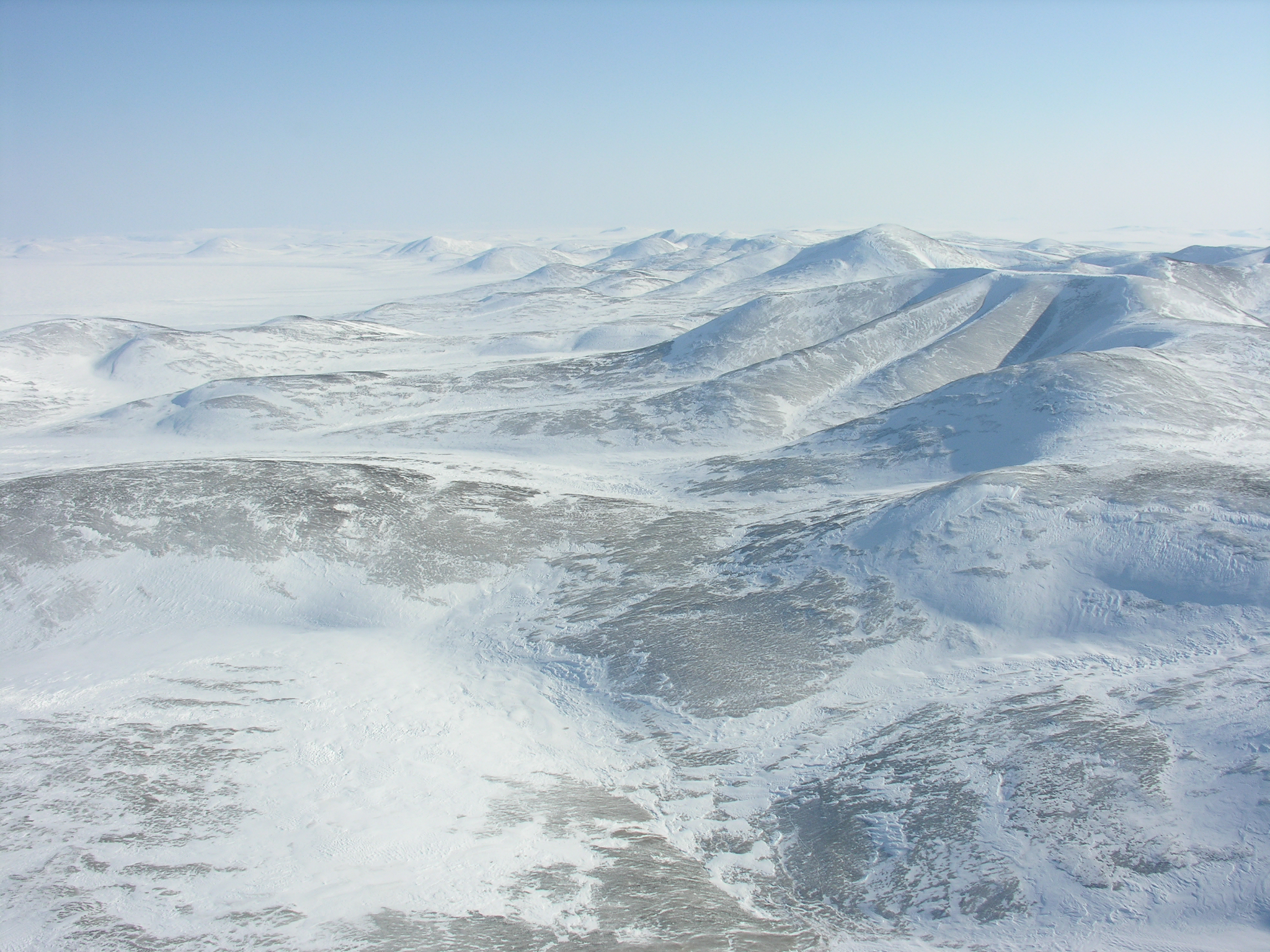 A view of the tundra from the helicopter. Aboard a helicopter en route to Camp El'gygytgyn, Chukotka, Russia.