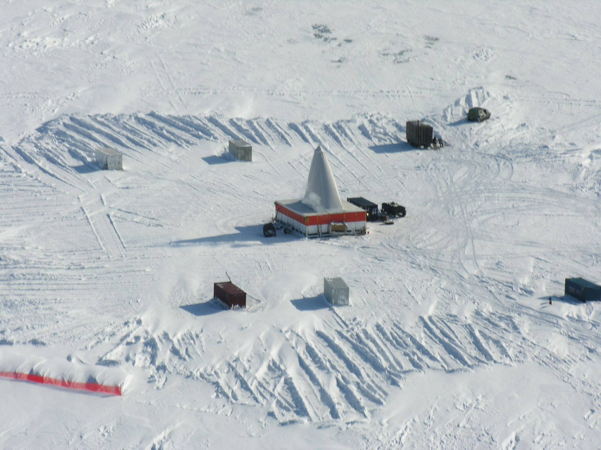 The Lake El'gygytgyn drilling platform from the air. Aboard a helicopter en route to Camp El'gygytgyn, Chukotka, Russia.