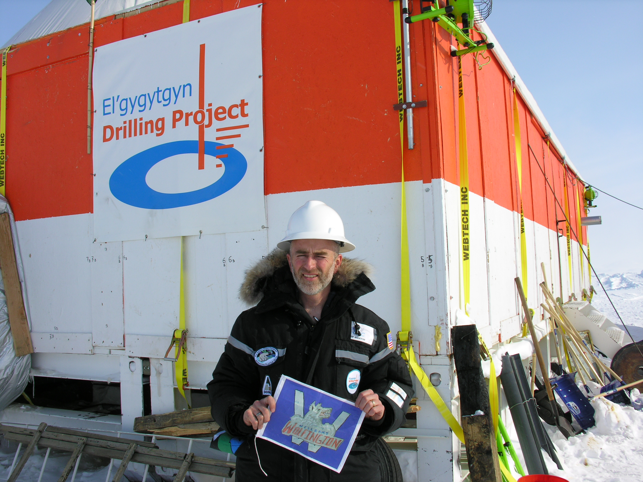 Tim Martin holds Mrs. Williams' Wolfington class flag at the drilling site at Lake El'gygytgyn, Chukotka, Russia.